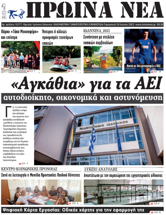 ΑρχικήΕΙΔΗΣΕΙΣΗΠΕΙΡΟΣ ΗΠΕΙΡΟΣ Τα πρωτοσέλιδα των γιαννιώτικων εφημερίδων 24.06.2022 102 FacebookTwitterWhatsAppEmailΤυπώνωViber Διαβάστε στα πρωτοσέλιδα των γιαννιώτικων εφημερίδων της Παρασκευής 24 Ιουνίου TagsΓΙΑΝΝΙΩΤΙΚΕΣ ΕΦΗΜΕΡΙΔΕΣΠΡΩΤΟΣΕΛΙΔΑ FacebookTwitterWhatsAppEmailΤυπώνωViber Προηγούμενο άρθροΣτα Γιάννενα Ευρωπαϊκό Συνέδριο για περιβαλλοντικούς ρύπουςΕπόμενο άρθροΚαταργείται η δημοκρατική λειτουργία του πανεπιστημίου ΣΧΕΤΙΚΑ ΑΡΘΡΑ Τα πρωτοσέλιδα των γιαννιώτικων εφημερίδων TOP STORIES 13.01.2026 Τα πρωτοσέλιδα των γιαννιώτικων εφημερίδων ΗΠΕΙΡΟΣ 11.01.2026 Τα πρωτοσέλιδα των γιαννιώτικων εφημερίδων ΗΠΕΙΡΟΣ 09.01.2026 Τα πρωτοσέλιδα των γιαννιώτικων εφημερίδων ΗΠΕΙΡΟΣ 08.01.2026 Τα πρωτοσέλιδα των γιαννιώτικων εφημερίδων ΗΠΕΙΡΟΣ 06.01.2026 Τα πρωτοσέλιδα των γιαννιώτικων εφημερίδων ΗΠΕΙΡΟΣ 01.01.2026 ΣΤΗΝ ΙΔΙΑ ΚΑΤΗΓΟΡΙΑ Με λαμπρότητα εορτάστηκε η μνήμη του Αγίου Ιερεμία στη Ζίτσα ΗΠΕΙΡΟΣ 13.01.2026 Γεωργόπουλος για Περιφέρεια Ηπείρου: «Αναγκαία αλλαγή ηγεσίας και διαφάνειας» ΗΠΕΙΡΟΣ 13.01.2026 Στην Κομισιόν οι διακοπές ρεύματος στην Ήπειρο ΗΠΕΙΡΟΣ 13.01.2026 Αντιδράσεις για τη συμφωνία Ε.Ε. – Mercosur και επιπτώσεις στον πρωτογενή τομέα της Ηπείρου ΗΠΕΙΡΟΣ 13.01.2026 Άμεση σύλληψη για κλοπή τσάντας από Ι.Χ. ΗΠΕΙΡΟΣ 13.01.2026 Συνελήφθη φυγόποινος στην Κακαβιά ΗΠΕΙΡΟΣ 13.01.2026 ΜΗ ΧΑΣΕΤΕ Το σχέδιο του Δήμου Ιωαννιτών για την αντιμετώπιση του κυκλοφοριακού προβλήματος Περιβαλλοντική καταστροφή στο Μονολίθι Πλημμύρισε ο χώρος πλύσης των απορριμματοφόρων του Δήμου «Μυρίζει συγκάλυψη ευθυνών» Δοκιμάζονται οι αντοχές των επιχειρήσεων ΔΗΜΟΦΙΛΗ Τα του Καίσαρος… Συνάντηση Τασούλα – Πιερρακάκη για την ελληνική οικονομία και τις ευρωπαϊκές προκλήσεις Απάντηση του Δήμου Ιωαννιτών για τις εγκαταστάσεις πλυσίματος απορριμματοφόρων Μαζική ρωσική επίθεση με drones και πυραύλους στην Ουκρανία Άμεση σύλληψη για κλοπή τσάντας από Ι.Χ.