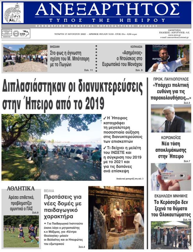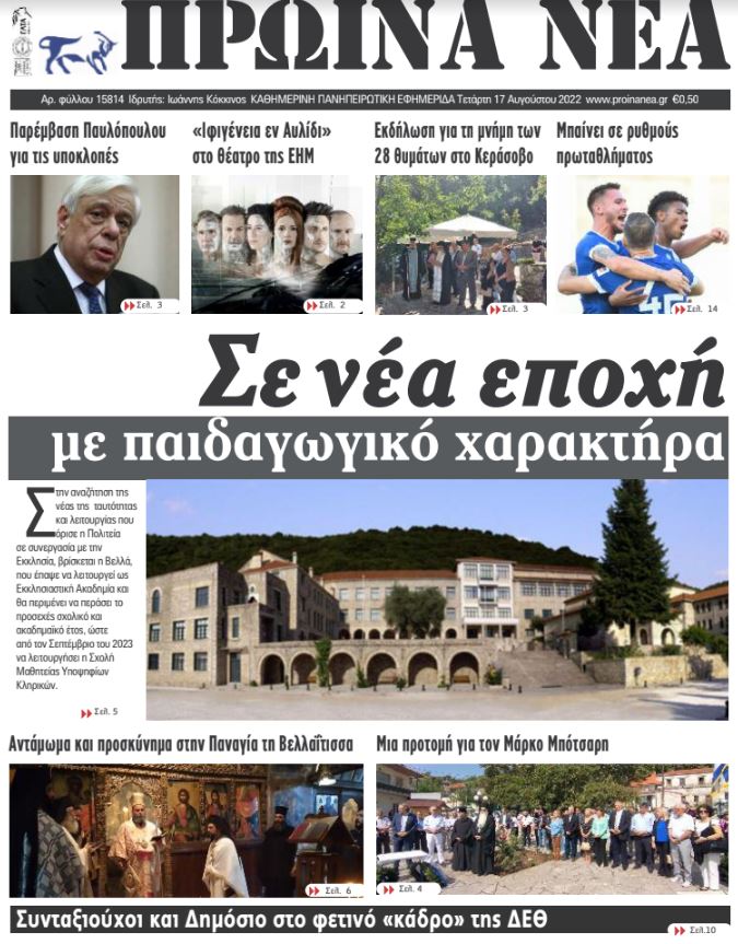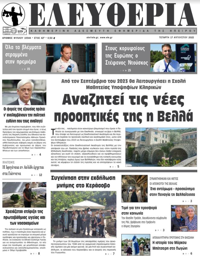 ΑρχικήΕΙΔΗΣΕΙΣΗΠΕΙΡΟΣ ΗΠΕΙΡΟΣ Τα πρωτοσέλιδα των γιαννιώτικων εφημερίδων 17.08.2022 168 FacebookTwitterWhatsAppEmailΤυπώνωViber Διαβάστε στα πρωτοσέλιδα των γιαννιώτικων εφημερίδων της Τετάρτης 17 Αυγούστου TagsΓΙΑΝΝΙΩΤΙΚΕΣ ΕΦΗΜΕΡΙΔΕΣΠΡΩΤΟΣΕΛΙΔΑ FacebookTwitterWhatsAppEmailΤυπώνωViber Προηγούμενο άρθροΆνδρας σε αμόκ προσπάθησε να βιάσει και να πετάξει από μπαλκόνι γυναίκαΕπόμενο άρθροΑποχρώσεις – Κάτι πάει λάθος ΣΧΕΤΙΚΑ ΑΡΘΡΑ Τα πρωτοσέλιδα των γιαννιώτικων εφημερίδων TOP STORIES 15.11.2025 Τα πρωτοσέλιδα των γιαννιώτικων εφημερίδων ΗΠΕΙΡΟΣ 14.11.2025 Τα πρωτοσέλιδα των γιαννιώτικων εφημερίδων ΗΠΕΙΡΟΣ 13.11.2025 Τα πρωτοσέλιδα των γιαννιώτικων εφημερίδων ΗΠΕΙΡΟΣ 12.11.2025 Τα πρωτοσέλιδα των γιαννιώτικων εφημερίδων ΗΠΕΙΡΟΣ 11.11.2025 Τα πρωτοσέλιδα των γιαννιώτικων εφημερίδων TOP STORIES 08.11.2025 ΣΤΗΝ ΙΔΙΑ ΚΑΤΗΓΟΡΙΑ Συνελήφθη μοτοσικλετιστής για επικίνδυνη οδήγηση ΗΠΕΙΡΟΣ 17.11.2025 Σύλληψη οδηγού για κλοπή σε περιοχή των Ιωαννίνων ΗΠΕΙΡΟΣ 17.11.2025 Ζούμπας: Αθλητικές υποδομές στην Ήπειρο χωρίς σχέδιο και πρόοδο ΗΠΕΙΡΟΣ 17.11.2025 Μπέγκας: Το Πολυτεχνείο ως διαχρονικό μήνυμα δημοκρατίας και ευθύνης ΗΠΕΙΡΟΣ 17.11.2025 Κορυφώνονται οι εκδηλώσεις για την εξέγερση του Πολυτεχνείου ΗΠΕΙΡΟΣ 17.11.2025 Ανήλικοι μπήκαν σε σπίτι και έκλεψαν πορτοφόλι ΗΠΕΙΡΟΣ 16.11.2025 ΜΗ ΧΑΣΕΤΕ Έκτακτο δελτίο της ΕΜΥ για ισχυρές βροχές και καταιγίδες Κορυφώνονται οι εκδηλώσεις για την εξέγερση του Πολυτεχνείου Ένας ζωντανός καθρέφτης της παράδοσης με βλέμμα στο μέλλον Μαθηματική έρευνα και κριτική σκέψη στην εποχή της Τεχνητής Νοημοσύνης Τα πρωτοσέλιδα των γιαννιώτικων εφημερίδων ΔΗΜΟΦΙΛΗ Κορυφώνονται οι εκδηλώσεις για την εξέγερση του Πολυτεχνείου Η Κομισιόν εξετάζει την επιβολή φόρου στα τρόφιμα υψηλής επεξεργασίας Πρωτογενές πλεόνασμα 10,3 δισ. στο δεκάμηνο Ιανουαρίου – Οκτωβρίου Τσίπρας: «Οι εξεγέρσεις δεν μπαίνουν σε μουσεία» Αλλάζει ο καιρός τις επόμενες ώρες – Επιστρέφει η αφρικανική σκόνη