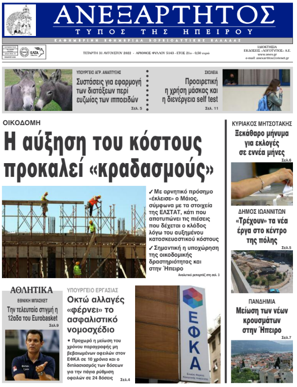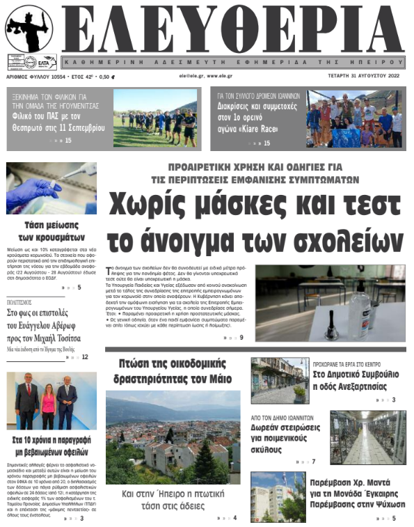 Διαβάστε στα πρωτοσέλιδα των γιαννιώτικων εφημερίδων της Τετάρτης 31 Αυγούστου