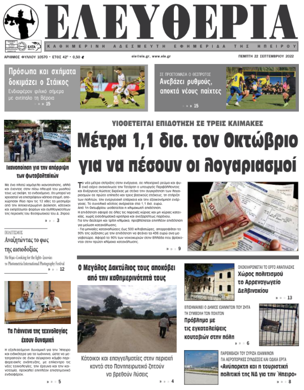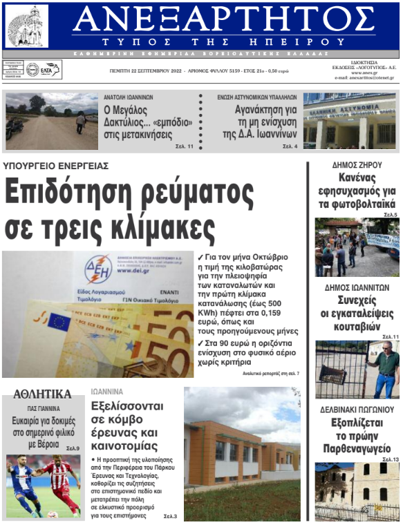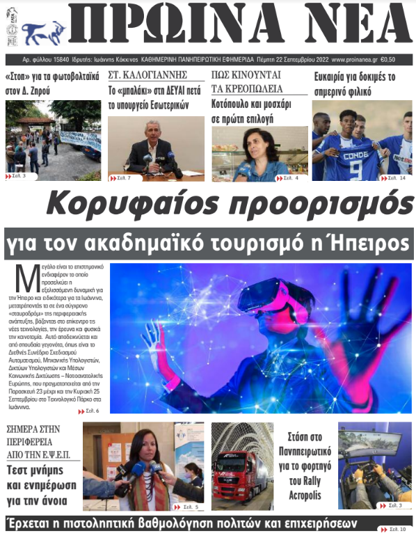 Διαβάστε στα πρωτοσέλιδα των γιαννιώτικων εφημερίδων της Πέμπτης 22 Σεπτεμβρίου