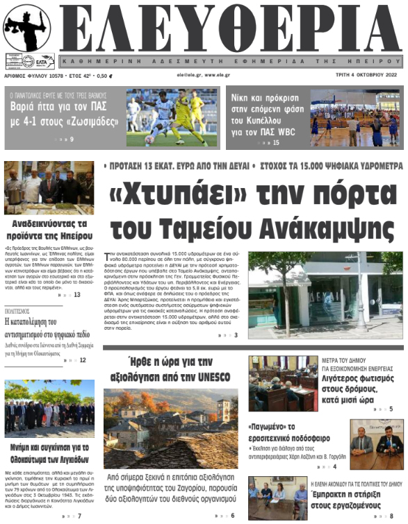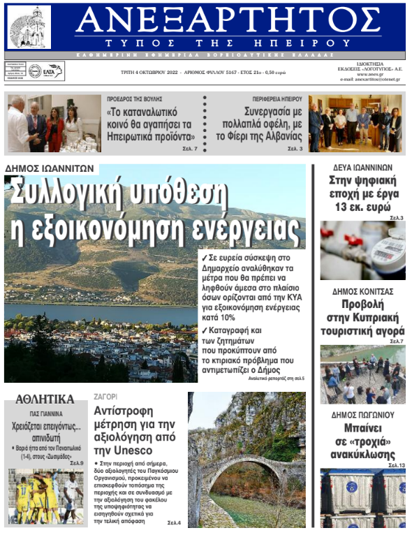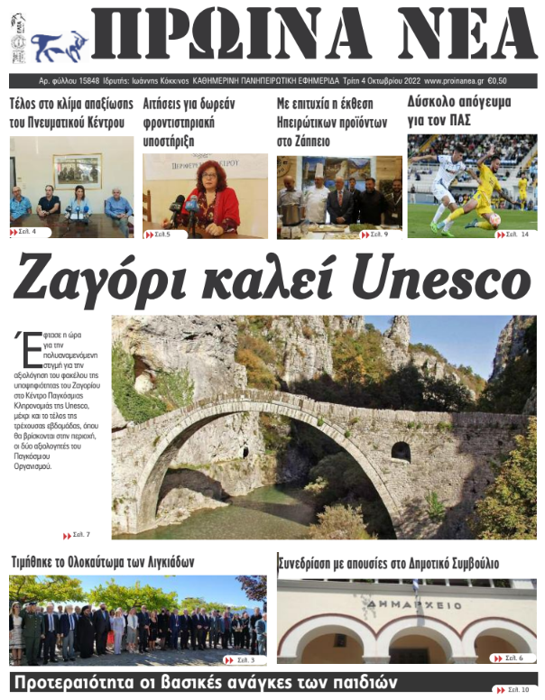 ΑρχικήΕΙΔΗΣΕΙΣΗΠΕΙΡΟΣ ΗΠΕΙΡΟΣ Τα πρωτοσέλιδα των γιαννιώτικων εφημερίδων 04.10.2022 174 FacebookTwitterWhatsAppEmailΤυπώνωViber Διαβάστε στα πρωτοσέλιδα των γιαννιώτικων εφημερίδων της Τρίτης 4 Οκτωβρίου TagsΓΙΑΝΝΙΩΤΙΚΕΣ ΕΦΗΜΕΡΙΔΕΣΠΡΩΤΟΣΕΛΙΔΑ FacebookTwitterWhatsAppEmailΤυπώνωViber Προηγούμενο άρθροΓ. ΣΤΥΛΙΟΣ -Επισκέψεις σε επιχειρήσεις του αγροδιατροφικού τομέαΕπόμενο άρθροΜπούτσικο, μια σπάνια φυλή προβάτου ΣΧΕΤΙΚΑ ΑΡΘΡΑ Τα πρωτοσέλιδα των γιαννιώτικων εφημερίδων TOP STORIES 28.11.2025 Τα πρωτοσέλιδα των γιαννιώτικων εφημερίδων ΗΠΕΙΡΟΣ 27.11.2025 Τα πρωτοσέλιδα των γιαννιώτικων εφημερίδων ΗΠΕΙΡΟΣ 26.11.2025 Τα πρωτοσέλιδα των γιαννιώτικων εφημερίδων ΗΠΕΙΡΟΣ 25.11.2025 Τα πρωτοσέλιδα των γιαννιώτικων εφημερίδων ΗΠΕΙΡΟΣ 22.11.2025 Τα πρωτοσέλιδα των γιαννιώτικων εφημερίδων ΗΠΕΙΡΟΣ 21.11.2025 ΣΤΗΝ ΙΔΙΑ ΚΑΤΗΓΟΡΙΑ Διαγωνισμός για έργα ενεργειακής αναβάθμισης στο ΠΓΝΙ ΗΠΕΙΡΟΣ 28.11.2025 Εισροή νερού σε δύο χειρουργικές αίθουσες στο νοσοκομείο «Χατζηκώστα» ΗΠΕΙΡΟΣ 28.11.2025 Άρτα: Αλλοδαπός έκλεψε 850 ευρώ από ηλικιωμένο ΗΠΕΙΡΟΣ 28.11.2025 Κοινός τόπος η ανάγκη εξάλειψης της βίας κατά των γυναικών ΗΠΕΙΡΟΣ 28.11.2025 Νέες κατολισθήσεις στα Τζουμέρκα μετά την κακοκαιρία ΗΠΕΙΡΟΣ 28.11.2025 Εμφανίστηκε ξανά η εποχική λίμνη Βρέλλη ΗΠΕΙΡΟΣ 28.11.2025 ΜΗ ΧΑΣΕΤΕ Σήμερα η επιστροφή ενοικίου στους δικαιούχους Σήμερα η «Black Friday»: Τι πρέπει να προσέξετε στις αγορές σας Νέες κατολισθήσεις στα Τζουμέρκα μετά την κακοκαιρία Εμφανίστηκε ξανά η εποχική λίμνη Βρέλλη Επιδόματα και προσλήψεις στο συνέδριο δικαστικών υπαλλήλων ΔΗΜΟΦΙΛΗ Καρέ – καρέ η επιχείρηση της Θηροφυλακής για τις «φόλες» στο Ξηροβούνι Ένταση και καταγγελίες στο Επιμελητήριο Ιωαννίνων Thanksgiving: Η ιστορία και οι παραδόσεις πίσω από την Ημέρα των Ευχαριστιών Επιδόματα και προσλήψεις στο συνέδριο δικαστικών υπαλλήλων Κοινός τόπος η ανάγκη εξάλειψης της βίας κατά των γυναικών
