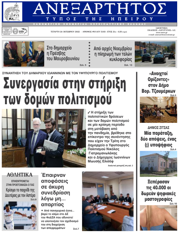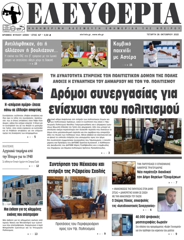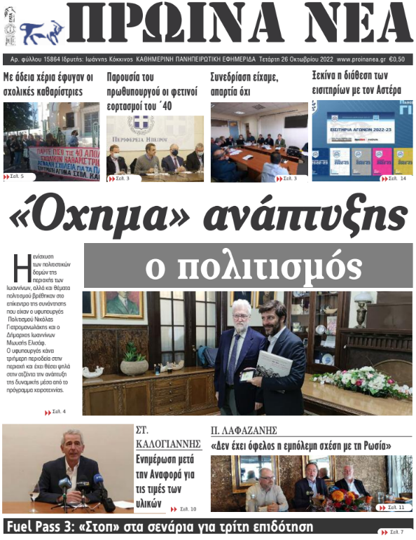 ΑρχικήΕΙΔΗΣΕΙΣΗΠΕΙΡΟΣ ΗΠΕΙΡΟΣ Τα πρωτοσέλιδα των γιαννιώτικων εφημερίδων 26.10.2022 243 FacebookTwitterWhatsAppEmailΤυπώνωViber Διαβάστε στα πρωτοσέλιδα των γιαννιώτικων εφημερίδων της Τετάρτης 26 Οκτωβρίου TagsΓΙΑΝΝΙΩΤΙΚΕΣ ΕΦΗΜΕΡΙΔΕΣΠΡΩΤΟΣΕΛΙΔΑ FacebookTwitterWhatsAppEmailΤυπώνωViber Προηγούμενο άρθροΘεσσαλονίκη: Μπήκε σε λεωφορείο με αλυσίδα και μαχαίρι και βγήκε από το παράθυρο!Επόμενο άρθροΗ «επόμενη ημέρα» έπεσε πάνω σε έλλειψη απαρτίας ΣΧΕΤΙΚΑ ΑΡΘΡΑ Τα πρωτοσέλιδα των γιαννιώτικων εφημερίδων TOP STORIES 08.11.2025 Τα πρωτοσέλιδα των γιαννιώτικων εφημερίδων ΗΠΕΙΡΟΣ 07.11.2025 Τα πρωτοσέλιδα των γιαννιώτικων εφημερίδων ΗΠΕΙΡΟΣ 06.11.2025 Τα πρωτοσέλιδα των γιαννιώτικων εφημερίδων ΗΠΕΙΡΟΣ 05.11.2025 Τα πρωτοσέλιδα των γιαννιώτικων εφημερίδων ΗΠΕΙΡΟΣ 04.11.2025 Τα πρωτοσέλιδα των γιαννιώτικων εφημερίδων TOP STORIES 01.11.2025 ΣΤΗΝ ΙΔΙΑ ΚΑΤΗΓΟΡΙΑ Τα πρωτοσέλιδα των γιαννιώτικων εφημερίδων TOP STORIES 08.11.2025 Μαθητές του 5ου Γυμνασίου Ιωαννίνων στην κορυφή του Μιτσικελίου ΗΠΕΙΡΟΣ 07.11.2025 Επίτιμος Διδάκτορας του Τμήματος Φιλολογίας ο Γιώργος Κεχαγιόγλου ΗΠΕΙΡΟΣ 07.11.2025 Οι ναυαγοσωστικές δαπάνες «πνίγουν» τους δήμους ΗΠΕΙΡΟΣ 07.11.2025 Ενημερωτική ημερίδα στα Ιωάννινα για τη δωρεά και μεταμόσχευση οργάνων ΗΠΕΙΡΟΣ 07.11.2025 Εγκαίνια στο Κατάστημα Αναμνηστικών του Πανεπιστημίου Ιωαννίνων ΗΠΕΙΡΟΣ 07.11.2025 ΜΗ ΧΑΣΕΤΕ Τα πρωτοσέλιδα των γιαννιώτικων εφημερίδων Οι ναυαγοσωστικές δαπάνες «πνίγουν» τους δήμους Έκτακτο δελτίο επιδείνωσης από την ΕΜΥ – Πού θα βρέχει το επόμενο τριήμερο Μπαλωθιές τέλος στην Κρήτη – Τα μέτρα για την παράνομη οπλοκατοχή Χωρίς πινακίδες παραμένουν χιλιάδες δίκυκλα ΔΗΜΟΦΙΛΗ Τα πρωτοσέλιδα των γιαννιώτικων εφημερίδων Γ. ΣΤΥΛΙΟΣ -Μείωση φόρων που ενισχύει το πραγματικό εισόδημα Η Ευρωπαϊκή Ένωση στηρίζει την καθαρή μετάβαση Ιταλία: Αυξάνονται οι αιωνόβιοι στη χώρα -2.000 περισσότεροι σε σχέση με πέρυσι ΤΗΝ ΔΕΥΤΕΡΑ -Νομαρχιακή Συνδιάσκεψη του ΣΥΡΙΖΑ ΠΣ Ιωαννίνων