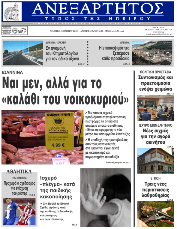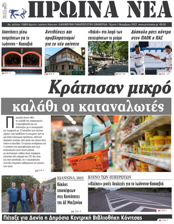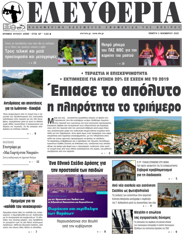 ΑρχικήTOP STORIES TOP STORIESΗΠΕΙΡΟΣ Τα πρωτοσέλιδα των γιαννιώτικων εφημερίδων 03.11.2022 235 FacebookTwitterWhatsAppEmailΤυπώνωViber Διαβάστε στα πρωτοσέλιδα των γιαννιώτικων εφημερίδων της Πέμπτης 3 Νοεμβρίου TagsΓΙΑΝΝΙΩΤΙΚΕΣ ΕΦΗΜΕΡΙΔΕΣΠΡΩΤΟΣΕΛΙΔΑ FacebookTwitterWhatsAppEmailΤυπώνωViber Προηγούμενο άρθροΠανικός σε πτήση στις ΗΠΑ –Πιλοτήριο και καμπίνα γέμισαν καπνούςΕπόμενο άρθροΜεγάλη η απώλεια της αγοραστικής δύναμης ΣΧΕΤΙΚΑ ΑΡΘΡΑ Τα πρωτοσέλιδα των γιαννιώτικων εφημερίδων TOP STORIES 17.12.2025 Τα πρωτοσέλιδα των γιαννιώτικων εφημερίδων ΗΠΕΙΡΟΣ 16.12.2025 Τα πρωτοσέλιδα των γιαννιώτικων εφημερίδων ΗΠΕΙΡΟΣ 13.12.2025 Τα πρωτοσέλιδα των γιαννιώτικων εφημερίδων ΗΠΕΙΡΟΣ 12.12.2025 Τα πρωτοσέλιδα των γιαννιώτικων εφημερίδων ΗΠΕΙΡΟΣ 11.12.2025 Τα πρωτοσέλιδα των γιαννιώτικων εφημερίδων ΗΠΕΙΡΟΣ 10.12.2025 ΣΤΗΝ ΙΔΙΑ ΚΑΤΗΓΟΡΙΑ Έκκληση για αιμοπετάλια και αίμα από τον Σύλλογο Εκπαιδευτικών Ιωαννίνων ΗΠΕΙΡΟΣ 17.12.2025 Αιφνιδιαστικοί έλεγχοι του ΟΠΕΚΕΠΕ σε κτηνοτροφικές μονάδες στους Λιγκιάδες ΗΠΕΙΡΟΣ 17.12.2025 Θετική η απόφαση του Δ.Σ. Φιλιατών για νέο σωφρονιστικό κατάστημα ΗΠΕΙΡΟΣ 17.12.2025 Διαγραφές φοιτητών στο Πανεπιστήμιο Ιωαννίνων – Κάλεσμα για συγκέντρωση ΗΠΕΙΡΟΣ 17.12.2025 Τα δύο «πρόσωπα» του παραλίμνιου μετώπου ΗΠΕΙΡΟΣ 17.12.2025 Έκκληση για τήρηση της καθαριότητας τις ημέρες των εορτών ΗΠΕΙΡΟΣ 17.12.2025 ΜΗ ΧΑΣΕΤΕ Νέα μέτρα για το στεγαστικό – Επιδότηση ανακαινίσεων και κίνητρα για εργαζόμενους εκτός αστικών κέντρων Τα δύο «πρόσωπα» του παραλίμνιου μετώπου Ιστορικό υψηλό σε δωρεές οργάνων και μεταμοσχεύσεις ΠΓΝΙ: Απόφαση-σταθμός για τους εργαζόμενους ορισμένου χρόνου – Στο τραπέζι η μονιμοποίηση Ηχηρό μήνυμα για την απόδοση των πόρων στους δήμους ΔΗΜΟΦΙΛΗ Τα δύο «πρόσωπα» του παραλίμνιου μετώπου Κίνδυνος ακρωτηριασμού για τον άνδρα που ακινητοποίησε τον ένοπλο στην παραλία Bondi Ενισχύσεις και χωρίς πλήρη ΚΑΕΚ για αγροτεμάχια έως 20 στρέμματα – Τι προβλέπει η εγκύκλιος Πτώση θερμοκρασίας, βροχές και χιόνια προς τα Χριστούγεννα Τσίμαρης: Σοβαρός κίνδυνος αποκλεισμού των τοπικών ΚΤΕΛ και αποδιάρθρωσης της αστικής συγκοινωνίας