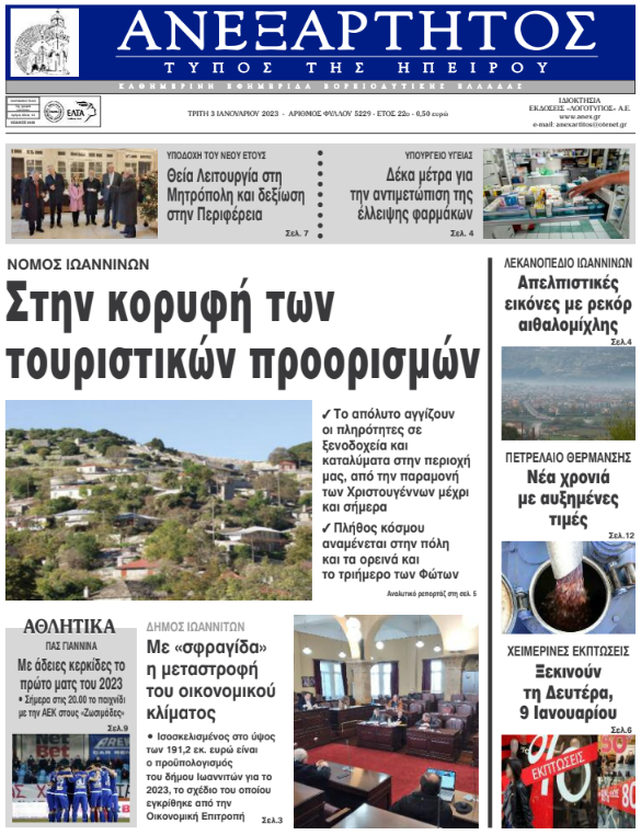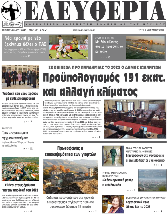ΑρχικήΕΙΔΗΣΕΙΣΗΠΕΙΡΟΣ ΗΠΕΙΡΟΣ Τα πρωτοσέλιδα των γιαννιώτικων εφημερίδων 03.01.2023 380 FacebookTwitterWhatsAppEmailΤυπώνωViber Διαβάστε στα πρωτοσέλιδα των γιαννιώτικων εφημερίδων της Τρίτης 3 Ιανουαρίου TagsΓΙΑΝΝΙΩΤΙΚΕΣ ΕΦΗΜΕΡΙΔΕΣΠΡΩΤΟΣΕΛΙΔΑ FacebookTwitterWhatsAppEmailΤυπώνωViber Προηγούμενο άρθροΥπουργείο Εργασίας: Σε ισχύ οι νέοι κανόνες και τα ψηφιακά εργαλεία για τις παροχές της ΔΥΠΑΕπόμενο άρθρο«Σπάει» αρνητικά ρεκόρ η αιθαλομίχλη ΣΧΕΤΙΚΑ ΑΡΘΡΑ Τα πρωτοσέλιδα των γιαννιώτικων εφημερίδων TOP STORIES 13.01.2026 Τα πρωτοσέλιδα των γιαννιώτικων εφημερίδων ΗΠΕΙΡΟΣ 11.01.2026 Τα πρωτοσέλιδα των γιαννιώτικων εφημερίδων ΗΠΕΙΡΟΣ 09.01.2026 Τα πρωτοσέλιδα των γιαννιώτικων εφημερίδων ΗΠΕΙΡΟΣ 08.01.2026 Τα πρωτοσέλιδα των γιαννιώτικων εφημερίδων ΗΠΕΙΡΟΣ 06.01.2026 Τα πρωτοσέλιδα των γιαννιώτικων εφημερίδων ΗΠΕΙΡΟΣ 01.01.2026 ΣΤΗΝ ΙΔΙΑ ΚΑΤΗΓΟΡΙΑ Με λαμπρότητα εορτάστηκε η μνήμη του Αγίου Ιερεμία στη Ζίτσα ΗΠΕΙΡΟΣ 13.01.2026 Γεωργόπουλος για Περιφέρεια Ηπείρου: «Αναγκαία αλλαγή ηγεσίας και διαφάνειας» ΗΠΕΙΡΟΣ 13.01.2026 Στην Κομισιόν οι διακοπές ρεύματος στην Ήπειρο ΗΠΕΙΡΟΣ 13.01.2026 Αντιδράσεις για τη συμφωνία Ε.Ε. – Mercosur και επιπτώσεις στον πρωτογενή τομέα της Ηπείρου ΗΠΕΙΡΟΣ 13.01.2026 Άμεση σύλληψη για κλοπή τσάντας από Ι.Χ. ΗΠΕΙΡΟΣ 13.01.2026 Συνελήφθη φυγόποινος στην Κακαβιά ΗΠΕΙΡΟΣ 13.01.2026 ΜΗ ΧΑΣΕΤΕ Το σχέδιο του Δήμου Ιωαννιτών για την αντιμετώπιση του κυκλοφοριακού προβλήματος Περιβαλλοντική καταστροφή στο Μονολίθι Πλημμύρισε ο χώρος πλύσης των απορριμματοφόρων του Δήμου «Μυρίζει συγκάλυψη ευθυνών» Δοκιμάζονται οι αντοχές των επιχειρήσεων ΔΗΜΟΦΙΛΗ Τα πρωτοσέλιδα των γιαννιώτικων εφημερίδων Χαρίτσης: Η κυβέρνηση Μητσοτάκη πρέπει να φύγει για την προστασία της κοινωνίας Με λαμπρότητα εορτάστηκε η μνήμη του Αγίου Ιερεμία στη Ζίτσα Novartis: Καταδίκες σε δεύτερο βαθμό για πρώην προστατευόμενους μάρτυρες Νέα ψυχρή εισβολή με βροχές και χιόνια το Σαββατοκύριακο