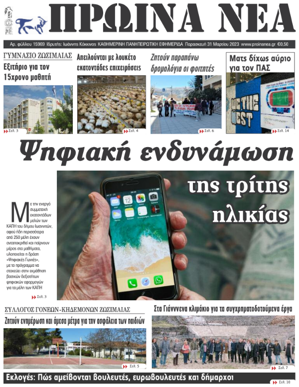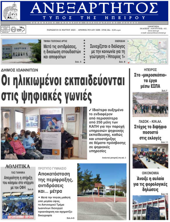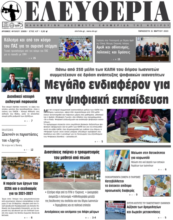 ΑρχικήTOP STORIES TOP STORIESΗΠΕΙΡΟΣ Τα πρωτοσέλιδα των γιαννιώτικων εφημερίδων 31.03.2023 434 FacebookTwitterWhatsAppEmailΤυπώνωViber Διαβάστε στα πρωτοσέλιδα των γιαννιώτικων εφημερίδων της Παρασκευής 31 Μαρτίου TagsΓΙΑΝΝΙΩΤΙΚΕΣ ΕΦΗΜΕΡΙΔΕΣΠΡΩΤΟΣΕΛΙΔΑ FacebookTwitterWhatsAppEmailΤυπώνωViber Προηγούμενο άρθροΞεκίνησαν οι πληρωμές του επιδόματος προσωπικής διαφοράςΕπόμενο άρθροΦύση – Κυνήγι – Ψάρεμα στη λίμνη Ζαραβίνα ΣΧΕΤΙΚΑ ΑΡΘΡΑ Τα πρωτοσέλιδα των γιαννιώτικων εφημερίδων ΗΠΕΙΡΟΣ 29.11.2025 Τα πρωτοσέλιδα των γιαννιώτικων εφημερίδων ΗΠΕΙΡΟΣ 28.11.2025 Τα πρωτοσέλιδα των γιαννιώτικων εφημερίδων ΗΠΕΙΡΟΣ 27.11.2025 Τα πρωτοσέλιδα των γιαννιώτικων εφημερίδων ΗΠΕΙΡΟΣ 26.11.2025 Τα πρωτοσέλιδα των γιαννιώτικων εφημερίδων ΗΠΕΙΡΟΣ 25.11.2025 Τα πρωτοσέλιδα των γιαννιώτικων εφημερίδων ΗΠΕΙΡΟΣ 22.11.2025 ΣΤΗΝ ΙΔΙΑ ΚΑΤΗΓΟΡΙΑ 270 αλκοτέστ και 8 παραβάσεις για μέθη στα Ιωάννινα ΗΠΕΙΡΟΣ 01.12.2025 Έξι συλλήψεις τις τελευταίες δύο εβδομάδες για κατοχή ναρκωτικών ΗΠΕΙΡΟΣ 01.12.2025 Το περιφερειακό συμβούλιο βράβευσε την ομάδα IGEM του Πανεπιστημίου Ιωαννίνων ΗΠΕΙΡΟΣ 01.12.2025 Δήμος Β. Τζουμέρκων: Σταθερά τα ανταποδοτικά τέλη και τα τέλη ύδρευσης για το 2026 ΗΠΕΙΡΟΣ 01.12.2025 Σύλληψη ανήλικου στα Ιωάννινα για κατοχή σιδερογροθιάς ΗΠΕΙΡΟΣ 01.12.2025 Συνελήφθη αλλοδαπή με ένταλμα στη Θεσπρωτία ΗΠΕΙΡΟΣ 01.12.2025 ΜΗ ΧΑΣΕΤΕ Κλιμακώνουν οι αγρότες: Έκλεισαν την εθνική οδό στα Μάλγαρα Νέα κακοκαιρία προ των πυλών – Πού θα χτυπήσει Υποχρεωτική η αποδοχή πληρωμών μέσω IRIS για συναλλαγές με ιδιώτες Διαχειρίσιμη η κατάσταση στα Τζουμέρκα – Μία κατοικία κατεδαφιστέα Τίμησαν τη μνήμη και τη θυσία του Λορέντζου Μαβίλη ΔΗΜΟΦΙΛΗ Προσωπικός Αριθμός: Έχει εκδοθεί για 9,3 εκατ. πολίτες, πού και γιατί υπάρχουν προβλήματα Ρεκόρ βροχής έφερε η κακοκαιρία Adel – Πού καταγράφηκαν τα μεγαλύτερα ύψη Κεραμέως: Η συμφωνία για τις συλλογικές συμβάσεις εργασίας προστατεύει περισσότερους εργαζομένους Νέα κακοκαιρία προ των πυλών – Πού θα χτυπήσει Ουκρανία: Τέσσερις νεκροί από ρωσικό πλήγμα στο Ντνίπρο