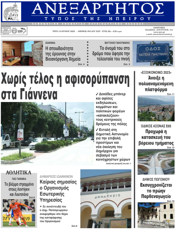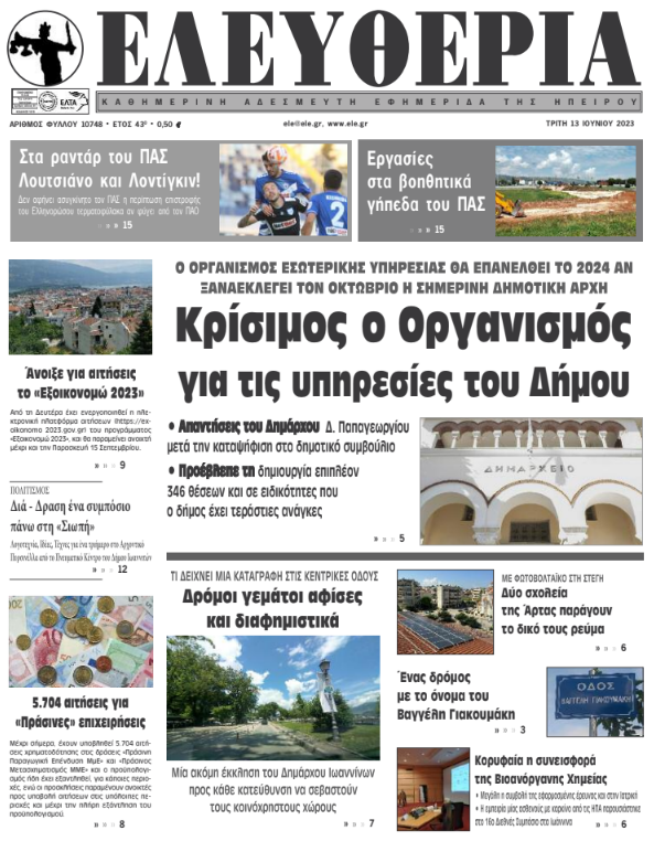 ΑρχικήΕΙΔΗΣΕΙΣΗΠΕΙΡΟΣ ΗΠΕΙΡΟΣ Τα πρωτοσέλιδα των γιαννιώτικων εφημερίδων 13.06.2023 1123 FacebookTwitterWhatsAppEmailΤυπώνωViber Διαβάστε στα πρωτοσέλιδα των γιαννιώτικων εφημερίδων της Τρίτης 13 Ιουνίου TagsΓΙΑΝΝΙΩΤΙΚΕΣ ΕΦΗΜΕΡΙΔΕΣΠΡΩΤΟΣΕΛΙΔΑ FacebookTwitterWhatsAppEmailΤυπώνωViber Προηγούμενο άρθροΔρόμοι γεμάτοι αφίσες και διαφημιστικάΕπόμενο άρθροΚορυφαία η συνεισφορά της Βιοανόργανης Χημείας ΣΧΕΤΙΚΑ ΑΡΘΡΑ Τα πρωτοσέλιδα των γιαννιώτικων εφημερίδων ΗΠΕΙΡΟΣ 06.12.2025 Τα πρωτοσέλιδα των γιαννιώτικων εφημερίδων ΗΠΕΙΡΟΣ 05.12.2025 Τα πρωτοσέλιδα των γιαννιώτικων εφημερίδων ΗΠΕΙΡΟΣ 04.12.2025 Τα πρωτοσέλιδα των γιαννιώτικων εφημερίδων ΗΠΕΙΡΟΣ 03.12.2025 Τα πρωτοσέλιδα των γιαννιώτικων εφημερίδων ΗΠΕΙΡΟΣ 02.12.2025 Τα πρωτοσέλιδα των γιαννιώτικων εφημερίδων ΗΠΕΙΡΟΣ 29.11.2025 ΣΤΗΝ ΙΔΙΑ ΚΑΤΗΓΟΡΙΑ Βραβεύτηκε ο Δήμος για την Προστασία των Ζώων Συντροφιάς ΗΠΕΙΡΟΣ 08.12.2025 Άρτα: Σύλληψη για μεταφορά παράτυπων μεταναστών ΗΠΕΙΡΟΣ 08.12.2025 Σύλληψη αλλοδαπού διωκόμενου στην Κακαβιά ΗΠΕΙΡΟΣ 08.12.2025 Διερεύνηση περιστατικού μέθης ανήλικης στα Ιωάννινα ΗΠΕΙΡΟΣ 08.12.2025 H ΝΙΚΗ χαιρετίζει το 1ο Πολυθεματικό Επιστημονικό Συνέδριο ΟΤΑ στα Ιωάννινα ΗΠΕΙΡΟΣ 08.12.2025 Ολική διακοπή κυκλοφορίας στην Ιόνια Οδό λόγω αγροτικών κινητοποιήσεων TOP STORIES 08.12.2025 ΜΗ ΧΑΣΕΤΕ Ολική διακοπή κυκλοφορίας στην Ιόνια Οδό λόγω αγροτικών κινητοποιήσεων Μπλόκα αγροτών: Αποκλεισμοί σε Εθνική, Εγνατία και Ιόνια Οδό Πού αναμένονται τοπικές βροχές και καταιγίδες Συντάξεις Ιανουαρίου: Από τις 19 Δεκεμβρίου ξεκινά η καταβολή τους Δώρο Χριστουγέννων: Ποιοι θα πάρουν περισσότερα, πώς υπολογίζεται και τι αλλάζει φέτος ΔΗΜΟΦΙΛΗ Εξιχνιάστηκε υπόθεση υπεξαίρεσης πορτοφολιού στην Ηγουμενίτσα Βραβεύτηκε ο Δήμος για την Προστασία των Ζώων Συντροφιάς Σεισμός 4,9 Ρίχτερ στην Αττάλεια της Τουρκίας Διερεύνηση περιστατικού μέθης ανήλικης στα Ιωάννινα Σύλληψη αλλοδαπού διωκόμενου στην Κακαβιά