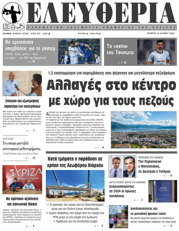 Διαβάστε στα πρωτοσέλιδα των γιαννιώτικων εφημερίδων της Τετάρτης 14 Ιουνίου
