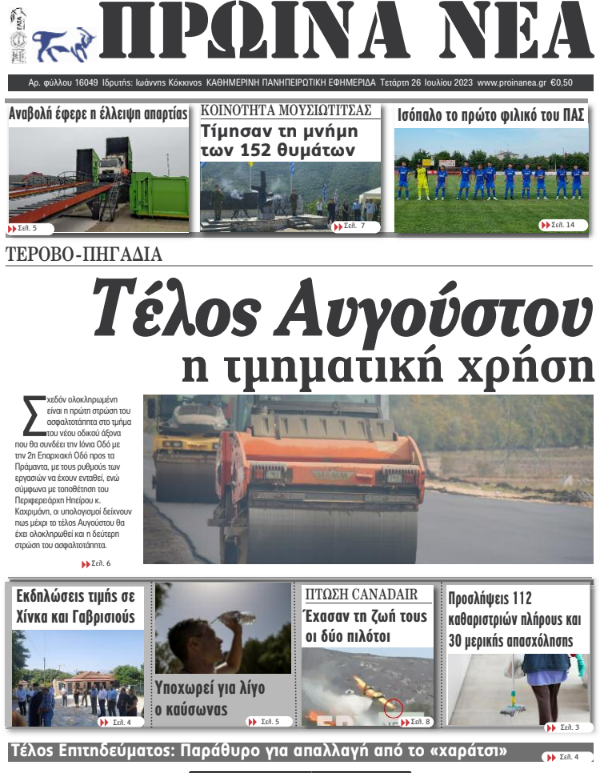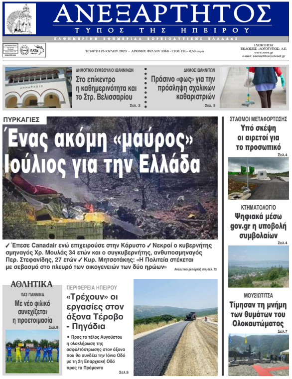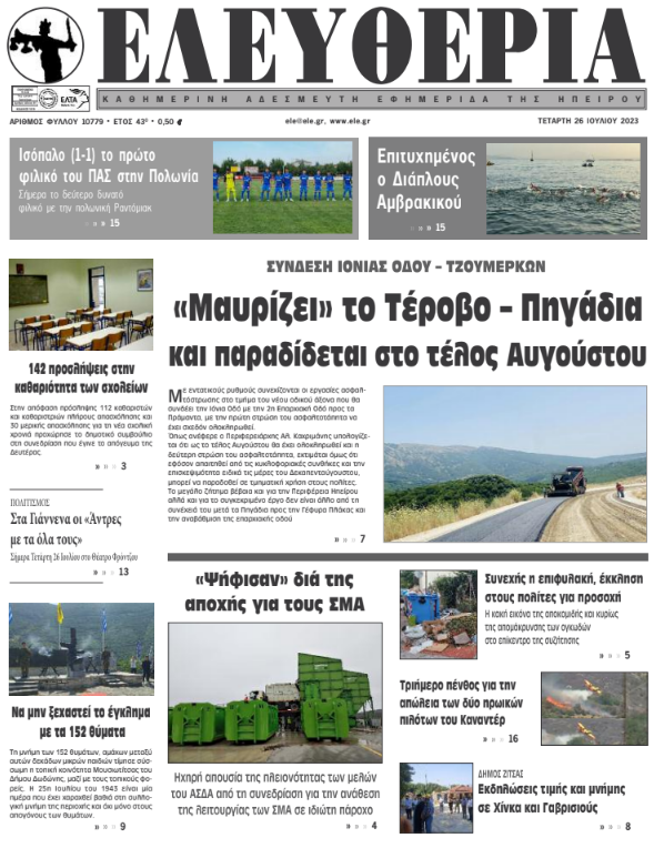Διαβάστε στα πρωτοσέλιδα των γιαννιώτικων εφημερίδων της Τετάρτης 26 Ιουλίου