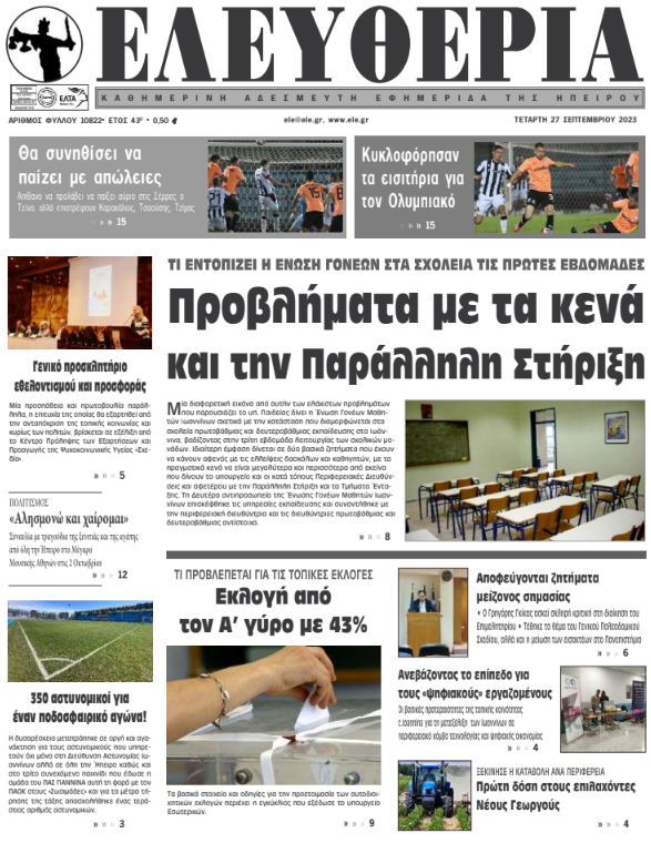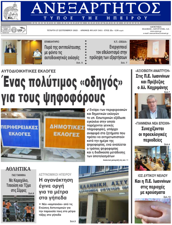 Διαβάστε στα πρωτοσέλιδα των γιαννιώτικων εφημερίδων της Τετάρτης 27 Σεπτεμβρίου