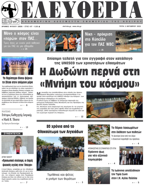 ΑρχικήΕΙΔΗΣΕΙΣΗΠΕΙΡΟΣ ΗΠΕΙΡΟΣ Τα πρωτοσέλιδα των γιαννιώτικων εφημερίδων 03.10.2023 0 FacebookTwitterWhatsAppEmailΤυπώνωViber Διαβάστε στα πρωτοσέλιδα των γιαννιώτικων εφημερίδων της Τρίτης 3 Οκτωβρίου TagsΓΙΑΝΝΙΩΤΙΚΕΣ ΕΦΗΜΕΡΙΔΕΣΠΡΩΤΟΣΕΛΙΔΑ FacebookTwitterWhatsAppEmailΤυπώνωViber Προηγούμενο άρθροΑμερική: Γιατί πεθαίνουν τα ροζ δελφίνια του ΑμαζονίουΕπόμενο άρθροΤο Περίπτερο Οίνου φέρνει τη Ζίτσα στην επόμενη μέρα ΣΧΕΤΙΚΑ ΑΡΘΡΑ Τα πρωτοσέλιδα των γιαννιώτικων εφημερίδων TOP STORIES 31.10.2025 Τα πρωτοσέλιδα των γιαννιώτικων εφημερίδων ΗΠΕΙΡΟΣ 30.10.2025 Τα πρωτοσέλιδα των γιαννιώτικων εφημερίδων ΗΠΕΙΡΟΣ 28.10.2025 Τα πρωτοσέλιδα των γιαννιώτικων εφημερίδων ΗΠΕΙΡΟΣ 25.10.2025 Τα πρωτοσέλιδα των γιαννιώτικων εφημερίδων ΗΠΕΙΡΟΣ 24.10.2025 Τα πρωτοσέλιδα των γιαννιώτικων εφημερίδων ΗΠΕΙΡΟΣ 23.10.2025 ΣΤΗΝ ΙΔΙΑ ΚΑΤΗΓΟΡΙΑ Αναβαθμίστηκε αισθητικά και λειτουργικά το Καμπέρειο Θέατρο ΗΠΕΙΡΟΣ 31.10.2025 Δίκτυο «Πίνδος»: Το γράμμα της ορεινής Ελλάδας δεν πρέπει να μείνει χωρίς παραλήπτη ΗΠΕΙΡΟΣ 31.10.2025 Οδηγούσε χωρίς άδεια που του είχε αφαιρεθεί λόγω μέθης ΗΠΕΙΡΟΣ 31.10.2025 Ακόμα δύο συλλήψεις για περιστατικό τραυματισμού ανηλίκου στη Θεσπρωτία ΗΠΕΙΡΟΣ 31.10.2025 Εξιχνίαση κλοπής κινητού από ηλικιωμένο στην Άρτα ΗΠΕΙΡΟΣ 31.10.2025 Σκληρή κριτική στη Δημ. Αρχή Δωδώνης από τον Γ. Καραμπίνα ΗΠΕΙΡΟΣ 31.10.2025 ΜΗ ΧΑΣΕΤΕ Ασταθής ο καιρός – Πού αναμένονται βροχές Μειωμένη η θετικότητα για covid-19 την τελευταία εβδομάδα Οι ιχθυολόγοι κρούουν τον κώδωνα του κινδύνου Αποκλεισμένοι ακόμη και από πάρκα και πλατείες… Τα πρωτοσέλιδα των γιαννιώτικων εφημερίδων ΔΗΜΟΦΙΛΗ Μειωμένη η θετικότητα για covid-19 την τελευταία εβδομάδα «Θηλασμός και τροφικές αλλεργίες» Η Σλοβακία θεσπίζει όριο ταχύτητας για τους πεζούς Ακόμα δύο συλλήψεις για περιστατικό τραυματισμού ανηλίκου στη Θεσπρωτία Αποφασισμένοι να κρατήσουν ανοιχτό το κατάστημα ΕΛΤΑ στα Πράμαντα