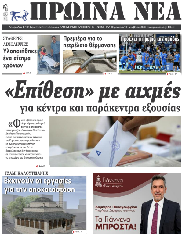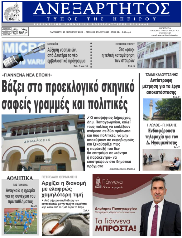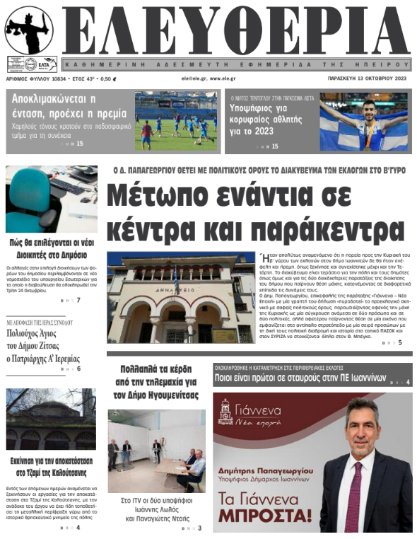 ΑρχικήΕΙΔΗΣΕΙΣΗΠΕΙΡΟΣ ΗΠΕΙΡΟΣ Τα πρωτοσέλιδα των γιαννιώτικων εφημερίδων 13.10.2023 0 FacebookTwitterWhatsAppEmailΤυπώνωViber Διαβάστε στα πρωτοσέλιδα των γιαννιώτικων εφημερίδων της Παρασκευής 13 Οκτωβρίου TagsΓΙΑΝΝΙΩΤΙΚΕΣ ΕΦΗΜΕΡΙΔΕΣΠΡΩΤΟΣΕΛΙΔΑ FacebookTwitterWhatsAppEmailΤυπώνωViber Προηγούμενο άρθροΑυτοί είναι οι μισθοί δημάρχων και αντιδημάρχωνΕπόμενο άρθροΠολλαπλά τα κέρδη από την τηλεμαχία για τον Δήμο Ηγουμενίτσας ΣΧΕΤΙΚΑ ΑΡΘΡΑ Τα πρωτοσέλιδα των γιαννιώτικων εφημερίδων ΗΠΕΙΡΟΣ 04.11.2025 Τα πρωτοσέλιδα των γιαννιώτικων εφημερίδων TOP STORIES 01.11.2025 Τα πρωτοσέλιδα των γιαννιώτικων εφημερίδων ΗΠΕΙΡΟΣ 31.10.2025 Τα πρωτοσέλιδα των γιαννιώτικων εφημερίδων ΗΠΕΙΡΟΣ 30.10.2025 Τα πρωτοσέλιδα των γιαννιώτικων εφημερίδων ΗΠΕΙΡΟΣ 28.10.2025 Τα πρωτοσέλιδα των γιαννιώτικων εφημερίδων ΗΠΕΙΡΟΣ 25.10.2025 ΣΤΗΝ ΙΔΙΑ ΚΑΤΗΓΟΡΙΑ Για «συντήρηση» του δρόμου στο Γράμμο τα ερπυστριοφόρα του Στρατού ΗΠΕΙΡΟΣ 04.11.2025 Η ΠΕΝΤΕ Α.Ε. απαντά στις καταγγελίες και υπερασπίζεται τη διαφάνεια στη συμφωνία με την «ΠΑΠΑΓΕΩΡΓΙΟΥ» ΗΠΕΙΡΟΣ 04.11.2025 Νέα δημοτική αγορά και παρεμβάσεις αναβάθμισης στην Αγία Μαρίνα ΗΠΕΙΡΟΣ 04.11.2025 Συμβολικές κινητοποιήσεις σε Μέτσοβο και Πωγώνι για τα καταστήματα ΕΛΤΑ ΗΠΕΙΡΟΣ 04.11.2025 Κινητοποίηση για τη διατήρηση του καταστήματος των ΕΛΤΑ Πραμάντων ΗΠΕΙΡΟΣ 04.11.2025 Κανένα θανατηφόρο τροχαίο φέτος τον Οκτώβριο TOP STORIES 04.11.2025 ΜΗ ΧΑΣΕΤΕ Για «συντήρηση» του δρόμου στο Γράμμο τα ερπυστριοφόρα του Στρατού Νέα δημοτική αγορά και παρεμβάσεις αναβάθμισης στην Αγία Μαρίνα Κανένα θανατηφόρο τροχαίο φέτος τον Οκτώβριο Ανοίγει η πλατφόρμα για το επίδομα θέρμανσης ΕΛΤΑ – Τρίμηνη αναστολή και κινητοποιήσεις στην Ήπειρο ΔΗΜΟΦΙΛΗ Εξιχνιάστηκε κλοπή από επιχείρηση στην Πρέβεζα Πέθανε ο πρώην αντιπρόεδρος των ΗΠΑ Ντικ Τσέινι Νεκροί επτά ορειβάτες μετά από χιονοστιβάδα στο Νεπάλ Για «συντήρηση» του δρόμου στο Γράμμο τα ερπυστριοφόρα του Στρατού ΕΛΤΑ – Τρίμηνη αναστολή και κινητοποιήσεις στην Ήπειρο