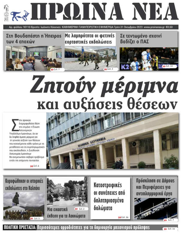 Διαβάστε στα πρωτοσέλιδα των γιαννιώτικων εφημερίδων της Τρίτης 31 Οκτωβρίου