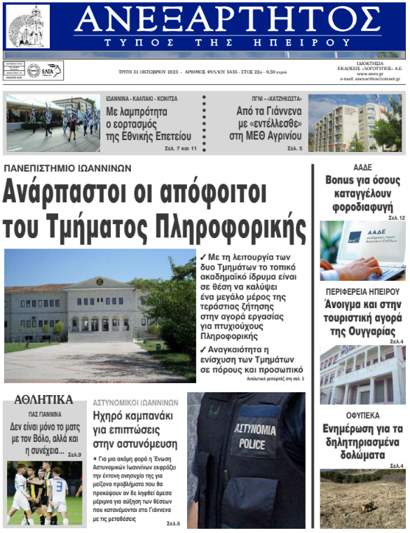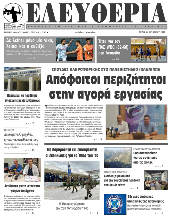 Διαβάστε στα πρωτοσέλιδα των γιαννιώτικων εφημερίδων της Τρίτης 31 Οκτωβρίου