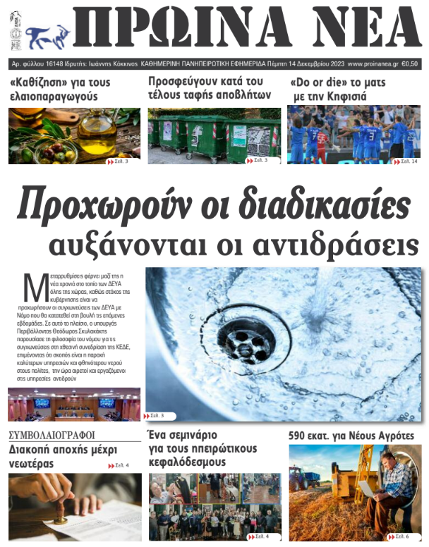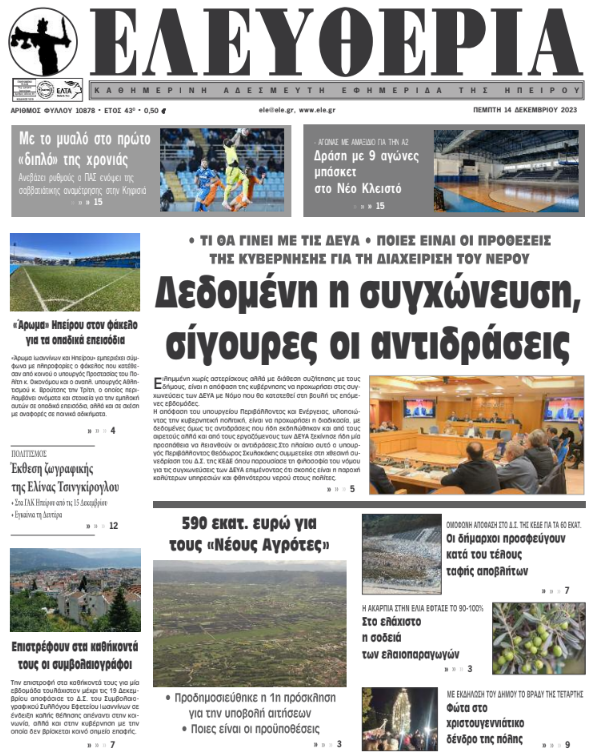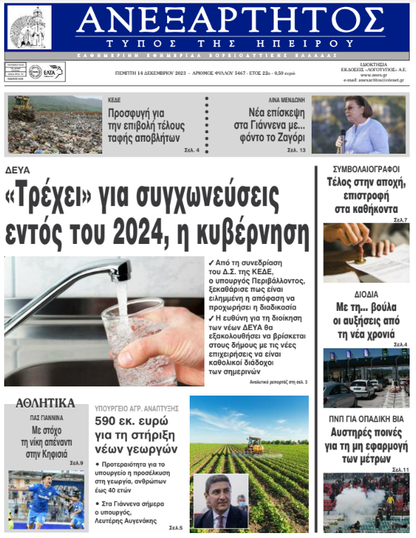 ΑρχικήΕΙΔΗΣΕΙΣΗΠΕΙΡΟΣ ΗΠΕΙΡΟΣ Τα πρωτοσέλιδα των γιαννιώτικων εφημερίδων 14.12.2023 0 FacebookTwitterWhatsAppEmailΤυπώνωViber Διαβάστε στα πρωτοσέλιδα των γιαννιώτικων εφημερίδων της Πέμπτης 14 Δεκεμβρίου TagsΓΙΑΝΝΙΩΤΙΚΕΣ ΕΦΗΜΕΡΙΔΕΣΠΡΩΤΟΣΕΛΙΔΑ FacebookTwitterWhatsAppEmailΤυπώνωViber Προηγούμενο άρθροΕπεισόδια στου Ρέντη: Βρέθηκε πυρίτιδα στα χέρια του 18χρονουΕπόμενο άρθροΕπιστρέφουν στα καθήκοντά τους οι συμβολαιογράφοι ΣΧΕΤΙΚΑ ΑΡΘΡΑ Τα πρωτοσέλιδα των γιαννιώτικων εφημερίδων TOP STORIES 08.11.2025 Τα πρωτοσέλιδα των γιαννιώτικων εφημερίδων ΗΠΕΙΡΟΣ 07.11.2025 Τα πρωτοσέλιδα των γιαννιώτικων εφημερίδων ΗΠΕΙΡΟΣ 06.11.2025 Τα πρωτοσέλιδα των γιαννιώτικων εφημερίδων ΗΠΕΙΡΟΣ 05.11.2025 Τα πρωτοσέλιδα των γιαννιώτικων εφημερίδων ΗΠΕΙΡΟΣ 04.11.2025 Τα πρωτοσέλιδα των γιαννιώτικων εφημερίδων TOP STORIES 01.11.2025 ΣΤΗΝ ΙΔΙΑ ΚΑΤΗΓΟΡΙΑ Τα πρωτοσέλιδα των γιαννιώτικων εφημερίδων TOP STORIES 08.11.2025 Μαθητές του 5ου Γυμνασίου Ιωαννίνων στην κορυφή του Μιτσικελίου ΗΠΕΙΡΟΣ 07.11.2025 Επίτιμος Διδάκτορας του Τμήματος Φιλολογίας ο Γιώργος Κεχαγιόγλου ΗΠΕΙΡΟΣ 07.11.2025 Οι ναυαγοσωστικές δαπάνες «πνίγουν» τους δήμους ΗΠΕΙΡΟΣ 07.11.2025 Ενημερωτική ημερίδα στα Ιωάννινα για τη δωρεά και μεταμόσχευση οργάνων ΗΠΕΙΡΟΣ 07.11.2025 Εγκαίνια στο Κατάστημα Αναμνηστικών του Πανεπιστημίου Ιωαννίνων ΗΠΕΙΡΟΣ 07.11.2025 ΜΗ ΧΑΣΕΤΕ Τα πρωτοσέλιδα των γιαννιώτικων εφημερίδων Οι ναυαγοσωστικές δαπάνες «πνίγουν» τους δήμους Έκτακτο δελτίο επιδείνωσης από την ΕΜΥ – Πού θα βρέχει το επόμενο τριήμερο Μπαλωθιές τέλος στην Κρήτη – Τα μέτρα για την παράνομη οπλοκατοχή Χωρίς πινακίδες παραμένουν χιλιάδες δίκυκλα ΔΗΜΟΦΙΛΗ Τα του Καίσαρος… Γ. ΣΤΥΛΙΟΣ -Μείωση φόρων που ενισχύει το πραγματικό εισόδημα Ιταλία: Αυξάνονται οι αιωνόβιοι στη χώρα -2.000 περισσότεροι σε σχέση με πέρυσι ΤΗΝ ΔΕΥΤΕΡΑ -Νομαρχιακή Συνδιάσκεψη του ΣΥΡΙΖΑ ΠΣ Ιωαννίνων Κατέρρευσε στο β’ ημίχρονο ο ΠΑΣ απέναντι στον Ηρακλή