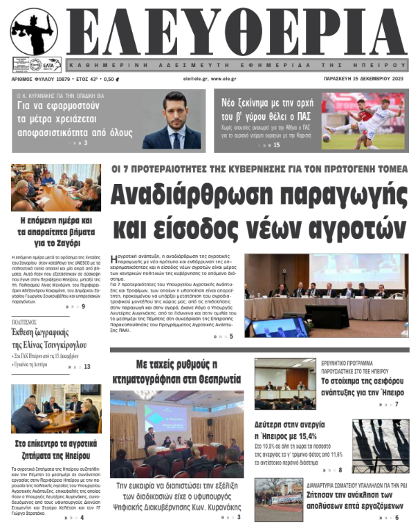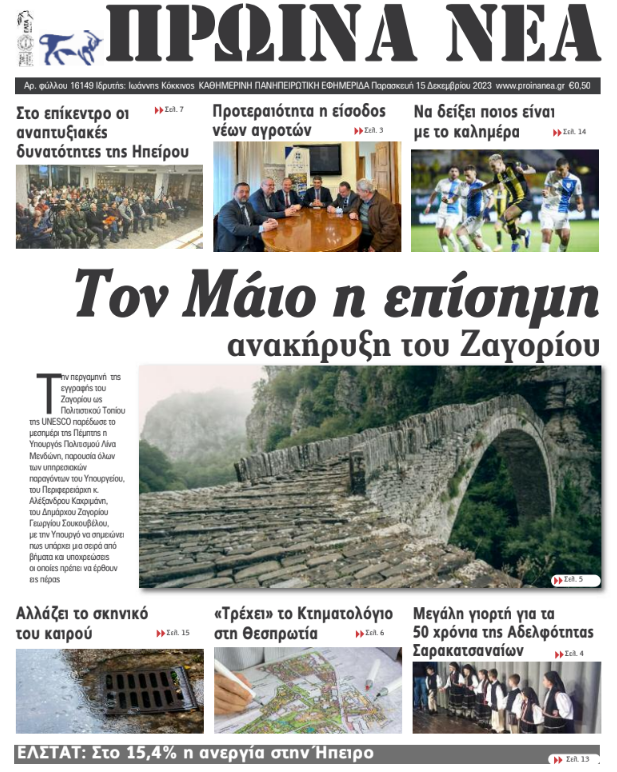 ΑρχικήTOP STORIES TOP STORIESΗΠΕΙΡΟΣ Τα πρωτοσέλιδα των γιαννιώτικων εφημερίδων 15.12.2023 0 FacebookTwitterWhatsAppEmailΤυπώνωViber Διαβάστε στα πρωτοσέλιδα των γιαννιώτικων εφημερίδων της Παρασκευής 15 Δεκεμβρίου TagsΓΙΑΝΝΙΩΤΙΚΕΣ ΕΦΗΜΕΡΙΔΕΣΠΡΩΤΟΣΕΛΙΔΑ FacebookTwitterWhatsAppEmailΤυπώνωViber Προηγούμενο άρθροΕύβοια: Αγνοείται 80χρονος -Πήγε να μαζέψει μανιτάρια και δεν επέστρεψεΕπόμενο άρθροΠερί τροχαίων ατυχημάτων και οδηγικής παιδείας… ΣΧΕΤΙΚΑ ΑΡΘΡΑ Τα πρωτοσέλιδα των γιαννιώτικων εφημερίδων TOP STORIES 01.11.2025 Τα πρωτοσέλιδα των γιαννιώτικων εφημερίδων ΗΠΕΙΡΟΣ 31.10.2025 Τα πρωτοσέλιδα των γιαννιώτικων εφημερίδων ΗΠΕΙΡΟΣ 30.10.2025 Τα πρωτοσέλιδα των γιαννιώτικων εφημερίδων ΗΠΕΙΡΟΣ 28.10.2025 Τα πρωτοσέλιδα των γιαννιώτικων εφημερίδων ΗΠΕΙΡΟΣ 25.10.2025 Τα πρωτοσέλιδα των γιαννιώτικων εφημερίδων ΗΠΕΙΡΟΣ 24.10.2025 ΣΤΗΝ ΙΔΙΑ ΚΑΤΗΓΟΡΙΑ Στάση εργασίας της ΑΔΕΔΥ στα Ιωάννινα την Πέμπτη 6 Νοεμβρίου ΗΠΕΙΡΟΣ 03.11.2025 Κυκλοφοριακές ρυθμίσεις στην Ιόνια Οδό στις 4 και 5 Νοεμβρίου ΗΠΕΙΡΟΣ 03.11.2025 Οι πληρωμές από e-ΕΦΚΑ και ΔΥΠΑ έως τις 7 Νοεμβρίου TOP STORIES 03.11.2025 Ιωάννινα: Σύλληψη καταστηματάρχη για διάθεση αλκοόλ σε ανήλικους ΗΠΕΙΡΟΣ 03.11.2025 Άρτα: Σύλληψη οδηγού χωρίς άδεια – Παραβίασε κόκκινο φανάρι με μοτοσικλέτα ΗΠΕΙΡΟΣ 03.11.2025 Βροχές και ήπιες θερμοκρασίες – Φθινοπωρινό ξεκίνημα για την εβδομάδα TOP STORIES 03.11.2025 ΜΗ ΧΑΣΕΤΕ Οι πληρωμές από e-ΕΦΚΑ και ΔΥΠΑ έως τις 7 Νοεμβρίου Βροχές και ήπιες θερμοκρασίες – Φθινοπωρινό ξεκίνημα για την εβδομάδα ΕΛΤΑ: Κλειστά δεκάδες καταστήματα από σήμερα – Η λίστα ανά περιοχή IRIS: Παράταση ενός μήνα και υποχρεωτική εφαρμογή από 1η Δεκεμβρίου Χρυσό μετάλλιο για την ομάδα iGEM Ioannina 2025 στο Παρίσι – Καινοτόμο έργο για τη διάσωση του ελληνικού πλατάνου ΔΗΜΟΦΙΛΗ Βορίζια: Σήμερα η κηδεία του 39χρονου – Φόβοι για νέο αιματοκύλισμα Ακόμη μία εντός έδρας νίκη για τον ΠΑΣ WBC (70-58 επί του Αμύντα) Στάση εργασίας της ΑΔΕΔΥ στα Ιωάννινα την Πέμπτη 6 Νοεμβρίου Επίδομα θέρμανσης: Πότε ξεκινά η υποβολή των αιτήσεων – Ποιοι οι δικαιούχοι Έκτακτο δελτίο επιδείνωσης – Πότε και πού ξεκινούν οι ισχυρές βροχές