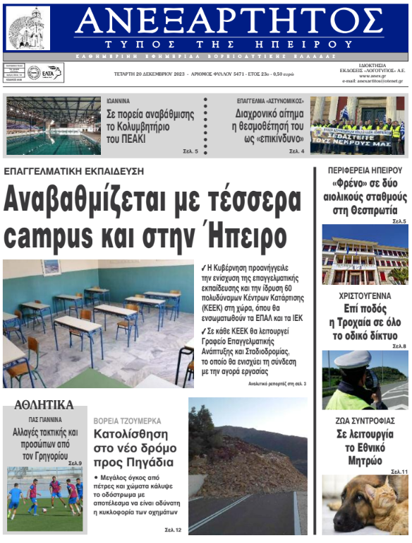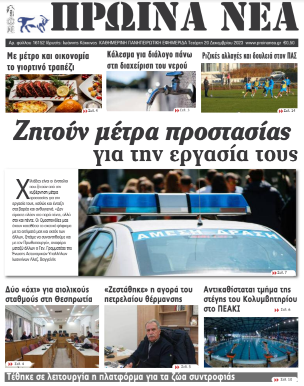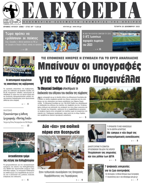 ΑρχικήΕΙΔΗΣΕΙΣΗΠΕΙΡΟΣ ΗΠΕΙΡΟΣ Τα πρωτοσέλιδα των γιαννιώτικων εφημερίδων 20.12.2023 0 FacebookTwitterWhatsAppEmailΤυπώνωViber Διαβάστε στα πρωτοσέλιδα των γιαννιώτικων εφημερίδων της Τετάρτης 20 Δεκεμβρίου TagsΓΙΑΝΝΙΩΤΙΚΕΣ ΕΦΗΜΕΡΙΔΕΣΠΡΩΤΟΣΕΛΙΔΑ FacebookTwitterWhatsAppEmailΤυπώνωViber Προηγούμενο άρθροΤρίκαλα: Άγρια συμπλοκή μαθητών στον Μύλο των ΞωτικώνΕπόμενο άρθροΟι αστυνομικοί περιμένουν τις απαντήσεις της κυβέρνησης ΣΧΕΤΙΚΑ ΑΡΘΡΑ Τα πρωτοσέλιδα των γιαννιώτικων εφημερίδων TOP STORIES 06.11.2025 Τα πρωτοσέλιδα των γιαννιώτικων εφημερίδων ΗΠΕΙΡΟΣ 05.11.2025 Τα πρωτοσέλιδα των γιαννιώτικων εφημερίδων ΗΠΕΙΡΟΣ 04.11.2025 Τα πρωτοσέλιδα των γιαννιώτικων εφημερίδων TOP STORIES 01.11.2025 Τα πρωτοσέλιδα των γιαννιώτικων εφημερίδων ΗΠΕΙΡΟΣ 31.10.2025 Τα πρωτοσέλιδα των γιαννιώτικων εφημερίδων ΗΠΕΙΡΟΣ 30.10.2025 ΣΤΗΝ ΙΔΙΑ ΚΑΤΗΓΟΡΙΑ Επιστροφή των εργαζομένων του «Γαλαξία» στις θέσεις τους ΗΠΕΙΡΟΣ 06.11.2025 Διαμαρτυρία των εργαζόμενων σε τουρισμό – επισιτισμό ΗΠΕΙΡΟΣ 06.11.2025 Καταγγελία της ΕΙΝΗ για τα «εντέλλεσθε» της 6ης ΥΠΕ ΗΠΕΙΡΟΣ 06.11.2025 Τα πρωτοσέλιδα των γιαννιώτικων εφημερίδων TOP STORIES 06.11.2025 «Άναψε πράσινο» για Σωφρονιστικό Κατάστημα στους Φιλιάτες ΗΠΕΙΡΟΣ 05.11.2025 206 πυρκαγιές με 61.000 καμένα στρέμματα στην Ήπειρο ΗΠΕΙΡΟΣ 05.11.2025 ΜΗ ΧΑΣΕΤΕ Υπεγράφη συμφωνία Energean, ExxonMobil και Helleniq Energy για γεώτρηση υδρογονανθράκων στο Ιόνιο Τα πρωτοσέλιδα των γιαννιώτικων εφημερίδων «Άναψε πράσινο» για Σωφρονιστικό Κατάστημα στους Φιλιάτες 206 πυρκαγιές με 61.000 καμένα στρέμματα στην Ήπειρο Κινητοποιήσεις για τα ΕΛΤΑ σε Μέτσοβο – Καναλάκι ΔΗΜΟΦΙΛΗ Η γήρανση του πληθυσμού ενδέχεται να οδηγήσει σε αύξηση των ανθεκτικών βακτηριακών λοιμώξεων του αίματος Επιστροφή των εργαζομένων του «Γαλαξία» στις θέσεις τους Υπεγράφη συμφωνία Energean, ExxonMobil και Helleniq Energy για γεώτρηση υδρογονανθράκων στο Ιόνιο Καταγγελία της ΕΙΝΗ για τα «εντέλλεσθε» της 6ης ΥΠΕ Εκδήλωση στην Ήπειρο για την Ευρωπαϊκή Ημέρα Γλωσσών