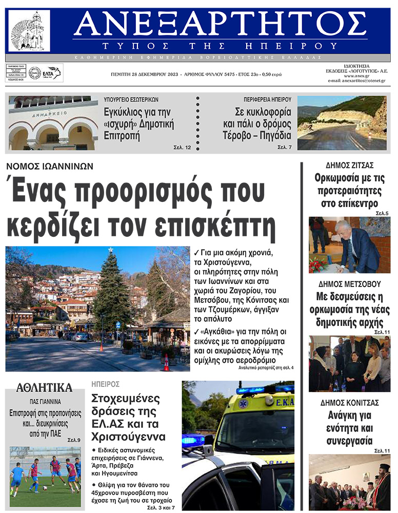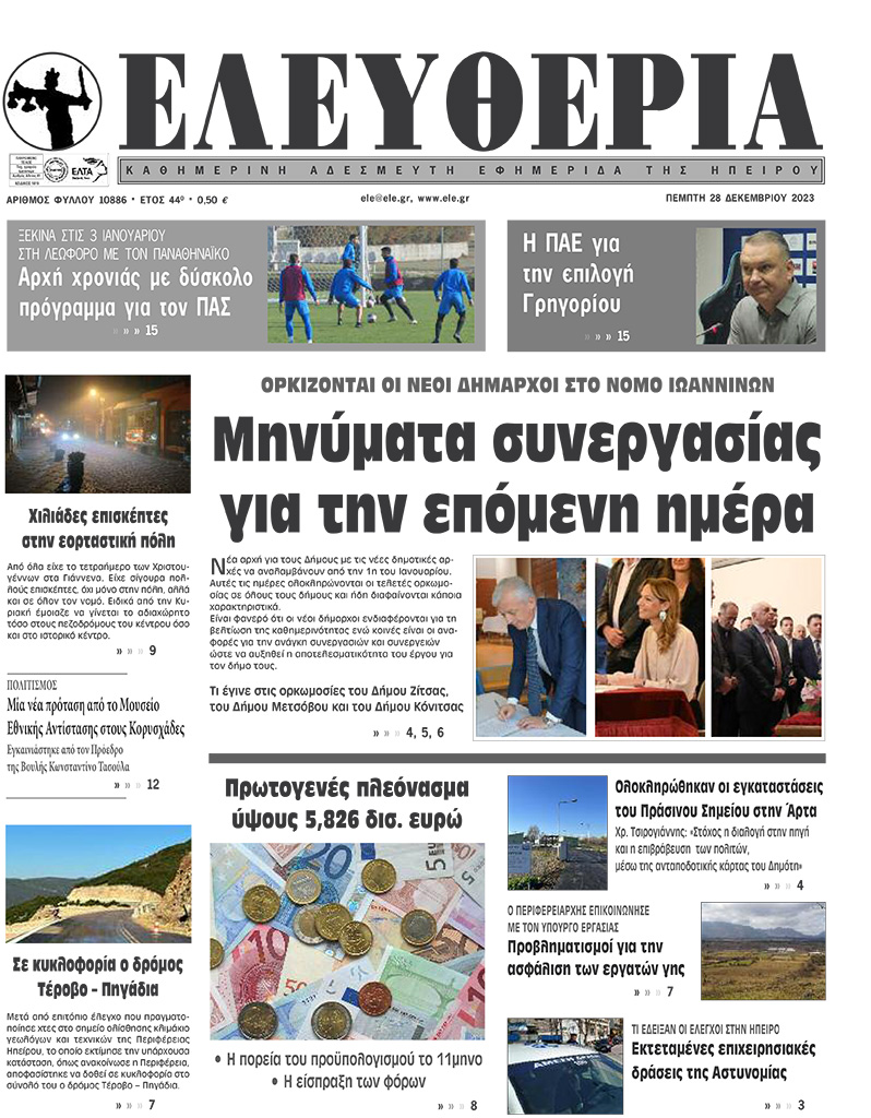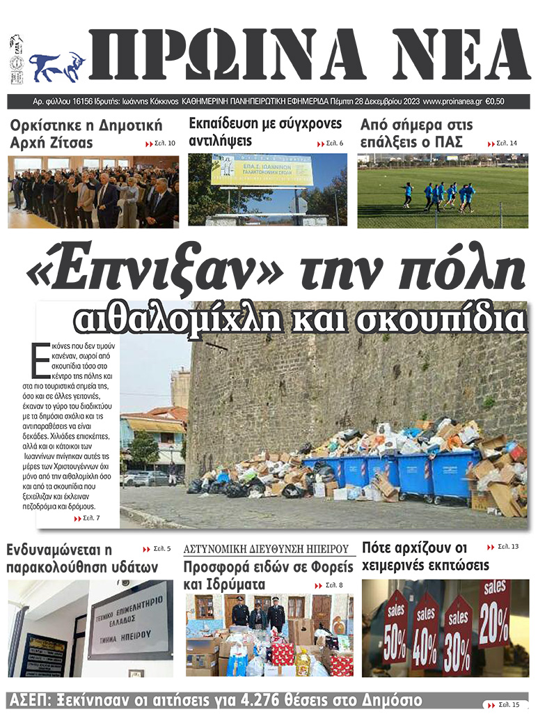 ΑρχικήΕΙΔΗΣΕΙΣΗΠΕΙΡΟΣ ΗΠΕΙΡΟΣ Τα πρωτοσέλιδα των γιαννιώτικων εφημερίδων 28.12.2023 0 FacebookTwitterWhatsAppEmailΤυπώνωViber Διαβάστε στα πρωτοσέλιδα των γιαννιώτικων εφημερίδων της Πέμπτης 28 Δεκεμβρίου TagsΓΙΑΝΝΙΩΤΙΚΕΣ ΕΦΗΜΕΡΙΔΕΣΠΡΩΤΟΣΕΛΙΔΑ FacebookTwitterWhatsAppEmailΤυπώνωViber Προηγούμενο άρθροΣε κυκλοφορία ο δρόμος Τέροβο – ΠηγάδιαΕπόμενο άρθροΘεσσαλονίκη: Μεθυσμένος ο Νορβηγός που σκότωσε τον 32χρονο αστυνομικό σε μπαρ ΣΧΕΤΙΚΑ ΑΡΘΡΑ Τα πρωτοσέλιδα των γιαννιώτικων εφημερίδων TOP STORIES 22.11.2025 Τα πρωτοσέλιδα των γιαννιώτικων εφημερίδων ΗΠΕΙΡΟΣ 21.11.2025 Τα πρωτοσέλιδα των γιαννιώτικων εφημερίδων TOP STORIES 20.11.2025 Τα πρωτοσέλιδα των γιαννιώτικων εφημερίδων ΗΠΕΙΡΟΣ 19.11.2025 Τα πρωτοσέλιδα των γιαννιώτικων εφημερίδων ΗΠΕΙΡΟΣ 18.11.2025 Τα πρωτοσέλιδα των γιαννιώτικων εφημερίδων ΗΠΕΙΡΟΣ 15.11.2025 ΣΤΗΝ ΙΔΙΑ ΚΑΤΗΓΟΡΙΑ Τα πρωτοσέλιδα των γιαννιώτικων εφημερίδων TOP STORIES 22.11.2025 Ημέρα Ενόπλων Δυνάμεων με αποκαλυπτήρια προτομών ΗΠΕΙΡΟΣ 21.11.2025 Έρευνες για φόλες στα Τζουμέρκα μετά τον θάνατο κυνηγετικών σκύλων ΗΠΕΙΡΟΣ 21.11.2025 Σε δημόσια πρόσκληση για την αξιοποίηση του Ξενία Ηγουμενίτσας προχωρά η ΕΤΑΔ ΗΠΕΙΡΟΣ 21.11.2025 Ήχησε το «112» στα Ιωάννινα ΗΠΕΙΡΟΣ 21.11.2025 Υπερχείλιση του Αράχθου στην Πλάκα – Φερτά υλικά κάλυψαν τη γέφυρα Μπέλεϋ ΗΠΕΙΡΟΣ 21.11.2025 ΜΗ ΧΑΣΕΤΕ Ικανοποίηση για τη μείωση της ανεργίας Τα πρωτοσέλιδα των γιαννιώτικων εφημερίδων Ημέρα Ενόπλων Δυνάμεων με αποκαλυπτήρια προτομών Ήχησε το «112» στα Ιωάννινα Υπερχείλιση του Αράχθου στην Πλάκα – Φερτά υλικά κάλυψαν τη γέφυρα Μπέλεϋ ΔΗΜΟΦΙΛΗ 22.698 εγγεγραμμένοι άνεργοι τον Οκτώβριο στην Ήπειρο Νέα μέτρα προστασίας της κτηνοτροφίας Τα πρωτοσέλιδα των γιαννιώτικων εφημερίδων ΥΠΕΡ e-ΕΦΚΑ -Επιστροφή αχρεωστήτως καταβληθέντων Τα του Καίσαρος…