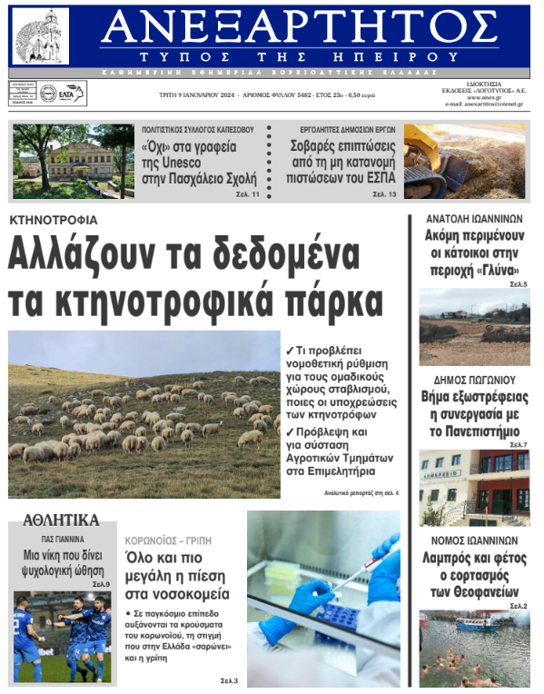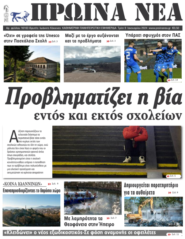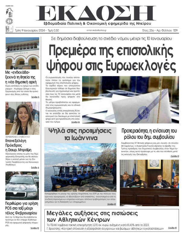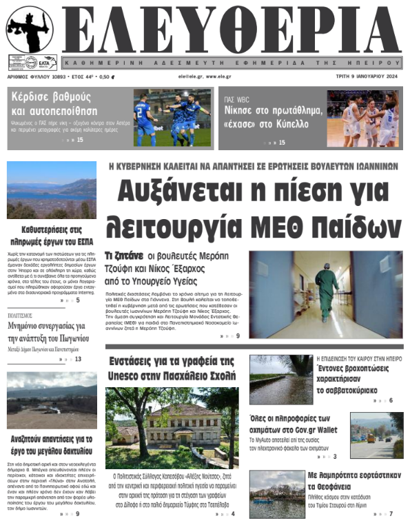 ΑρχικήΕΙΔΗΣΕΙΣΗΠΕΙΡΟΣ ΗΠΕΙΡΟΣ Τα πρωτοσέλιδα των γιαννιώτικων εφημερίδων 09.01.2024 0 FacebookTwitterWhatsAppEmailΤυπώνωViber Διαβάστε στα πρωτοσέλιδα των γιαννιώτικων εφημερίδων της Τρίτης 9 Ιανουαρίου TagsΓΙΑΝΝΙΩΤΙΚΕΣ ΕΦΗΜΕΡΙΔΕΣΠΡΩΤΟΣΕΛΙΔΑ FacebookTwitterWhatsAppEmailΤυπώνωViber Προηγούμενο άρθροΝέο… τηλεγράφημαΕπόμενο άρθροΈντονες βροχοπτώσεις χαρακτήρισαν το Σαββατοκύριακο ΣΧΕΤΙΚΑ ΑΡΘΡΑ Τα πρωτοσέλιδα των γιαννιώτικων εφημερίδων TOP STORIES 08.11.2025 Τα πρωτοσέλιδα των γιαννιώτικων εφημερίδων ΗΠΕΙΡΟΣ 07.11.2025 Τα πρωτοσέλιδα των γιαννιώτικων εφημερίδων ΗΠΕΙΡΟΣ 06.11.2025 Τα πρωτοσέλιδα των γιαννιώτικων εφημερίδων ΗΠΕΙΡΟΣ 05.11.2025 Τα πρωτοσέλιδα των γιαννιώτικων εφημερίδων ΗΠΕΙΡΟΣ 04.11.2025 Τα πρωτοσέλιδα των γιαννιώτικων εφημερίδων TOP STORIES 01.11.2025 ΣΤΗΝ ΙΔΙΑ ΚΑΤΗΓΟΡΙΑ Τροχαίο με έναν τραυματία στο Κλειστό Άρτας ΗΠΕΙΡΟΣ 10.11.2025 Παρέλαβε δέμα με ναρκωτικά από θυρίδα ταχυμεταφορών ΗΠΕΙΡΟΣ 10.11.2025 Κοινό των Ηπειρωτών: Ανάγκη για πλήρη διαφάνεια στις παρεμβάσεις στον Γράμμο ΗΠΕΙΡΟΣ 10.11.2025 Μεγάλα προβλήματα από την κακοκαιρία σε Φιλιππιάδα, Πρέβεζα και Βόνιτσα ΗΠΕΙΡΟΣ 10.11.2025 Σύλληψη σε κατάστημα στα Ιωάννινα για διάθεση αλκοόλ σε ανηλίκους ΗΠΕΙΡΟΣ 10.11.2025 Συνελήφθη οδηγός στην Ιόνια Οδό υπό την επήρεια αλκοόλ ΗΠΕΙΡΟΣ 10.11.2025 ΜΗ ΧΑΣΕΤΕ Τον Ιούνιο θα εγκατασταθούν οι 1.000 κάμερες στους δρόμους -Βodycam και σε αστυνομικούς Συντάξεις Δεκεμβρίου: Πότε θα καταβληθούν Ο «χάρτης» των πληρωμών από τον e-ΕΦΚΑ και τη ΔΥΠΑ έως την Παρασκευή 14 Νοεμβρίου Η Ελλάδα πρώτη στην ΕΕ σε πολίτες χωρίς αναγκαία ιατρική περίθαλψη Μεγάλα προβλήματα από την κακοκαιρία σε Φιλιππιάδα, Πρέβεζα και Βόνιτσα ΔΗΜΟΦΙΛΗ Επικαιροποιήθηκε το έκτακτο δελτίο καιρού Ημερίδα με στόχο την έμπνευση και ενδυνάμωση της νέας γενιάς Την Τρίτη το πανελλαδικό συλλαλητήριο αγροτών στην Αθήνα Συντάξεις: Το λάθος που κοστίζει έως 100 ευρώ τον μήνα Συντάξεις Δεκεμβρίου: Πότε θα καταβληθούν