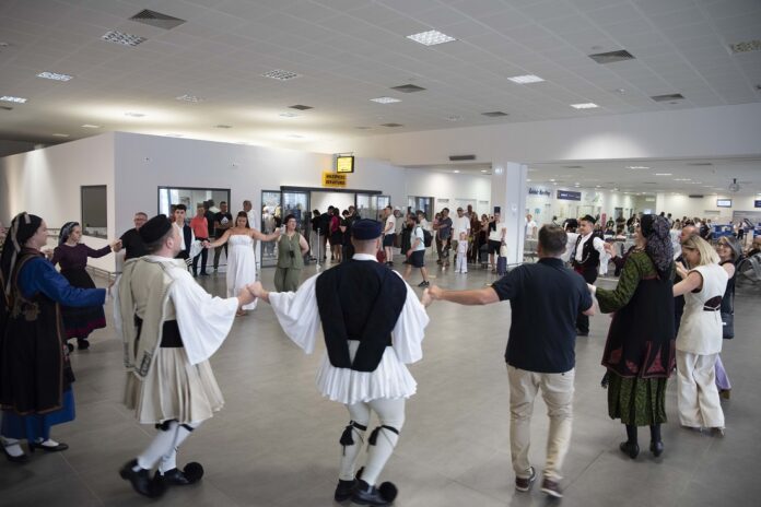Για περίπου 40 λεπτά, η αίθουσα του αεροδρομίου μεταμορφώθηκε σε μια ζωντανή σκηνή της τζουμερκιώτικης παράδοσης: ο ήχος του κλαρίνου, οι χορευτικές φιγούρες και οι παραδοσιακές ενδυμασίες γέμισαν τον χώρο και τράβηξαν την προσοχή επιβατών και επισκεπτών.