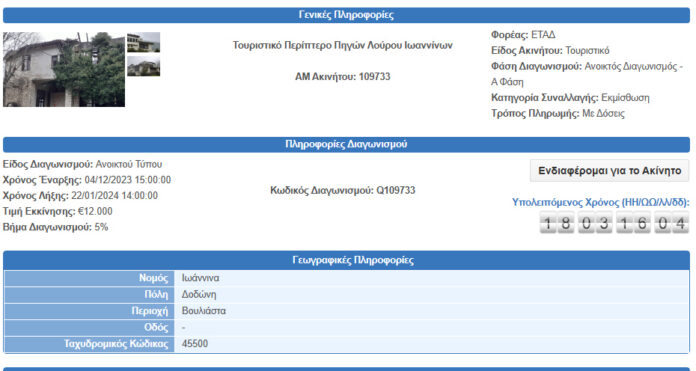 Με τιμή εκκίνησης του διαγωνισμού το ποσό των 12.000 ευρώ εξελίσσεται από τις αρχές Δεκεμβρίου και ολοκληρώνεται στις 22 Ιανουαρίου, ο ανοιχτός διαγωνισμός για την αξιοποίηση του Τουριστικού περιπτέρου (πρώην ΕΟΤ) στις πηγές Λούρου στη Βουλιάστα του δήμου Δωδώνης.