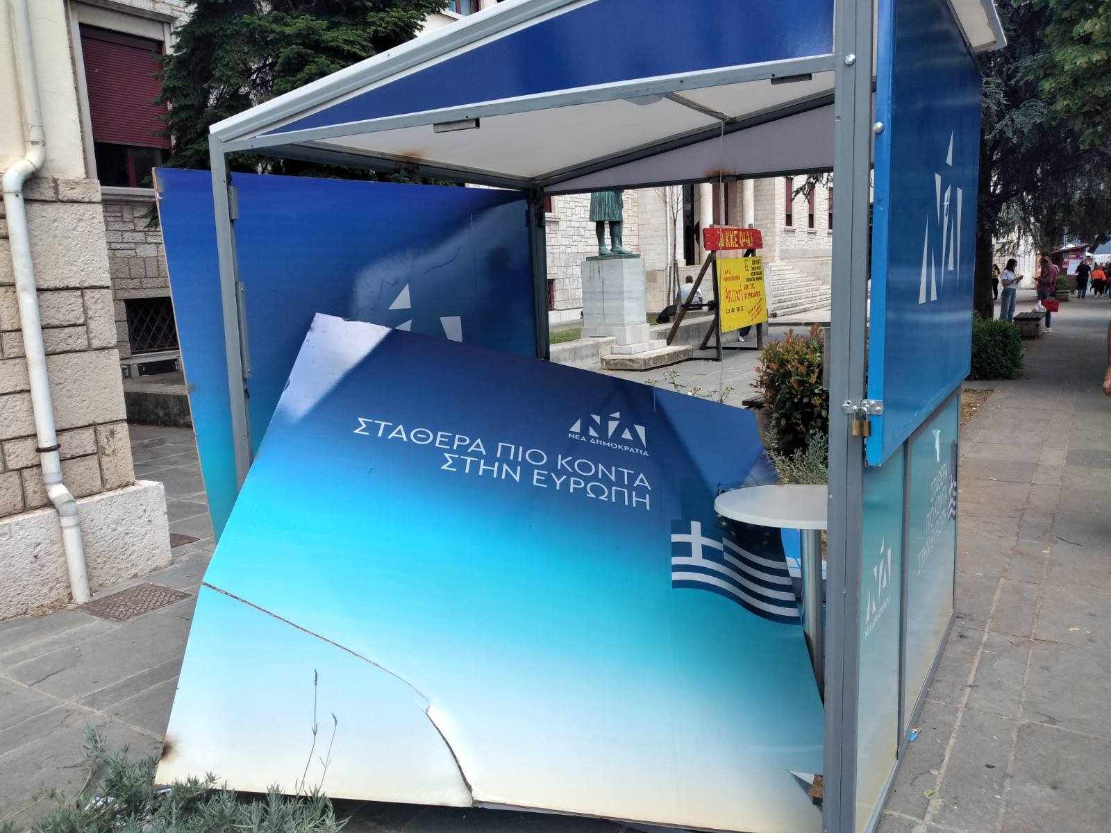 Άγνωστοι βανδάλισαν το προεκλογικό περίπτερο της Νέας Δημοκρατίας έξω από το διοικητήριο της Περιφέρειας Ηπείρου, νωρίς τα ξημερώματα της Πέμπτης, κατά τη διάρκεια των πανηγυρισμών για την κατάκτηση του Conference League από τον Ολυμπιακό.