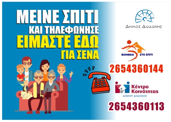 Ο Δήμος Δωδώνης στο πλαίσιο εφαρμογής των μέτρων για την προστασία του κοινωνικού συνόλου από τη διάδοση του κορωνοϊού, εντατικοποιεί τις υπηρεσίες κοινωνικής φροντίδας και αλληλεγγύης του Κέντρου Κοινότητας σε συνεργασία με τις δομές του προγράμματος «Βοήθεια στο Σπίτι», σύμφωνα με την εγκύκλιο με υπ’ αριθμ.:18659/17/03/2020, που απέστειλε το Υπουργείο Εσωτερικών, με ενέργειες οι οποίες συνίστανται στα εξής: