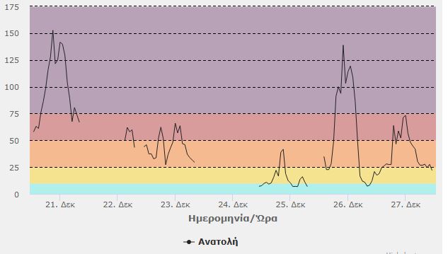Ο σταθμός μέτρησης στην Ανατολή στις 21 Δεκεμβρίου στις 21.00 κατέγραψε συγκέντρωση μικροσωματιδίων σε ποσοστά 152,7 μικρογραμμάρια ανά κυβικό μέτρο ενώ την ίδια ημέρα και ώρα ο σταθμός στην Περιφέρεια κατέγραψε 135,6 μικρογραμμάρια.