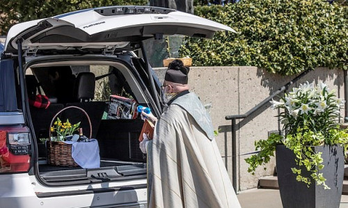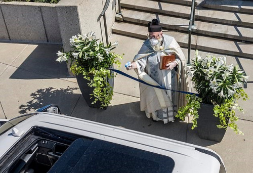 Ο αιδεσιμότατος Τίμοθι Πελκ, φορώντας μάσκα, ασπίδα προσώπου και γάντια ως επιπλέον μέτρα αυτοπροστασίας, εκτόξευε με νεροπίστολο αγιασμό σε κάθε αυτοκίνητο που σταματούσε μπροστά στα σκαλοπάτια του Αγίου Αμβροσίου στο Ντιτρόιτ.