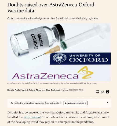 Σύμφωνα τους Financial Times, το πανεπιστήμιο της Οξφόρδης αναγνώρισε πως ένα λάθος οδήγησε αναγκαστικά σε διαφορετική δοσολογία σε ένα τμήμα των εθελοντών. Η τελευταία εξέλιξη προκάλεσε αντιδράσεις για τον τρόπο που το πανεπιστήμιο και η φαρμακευτική εταιρεία διαχειρίστηκαν και παρουσίασαν την πρώτη ανάλυση των κλινικών δοκιμών.