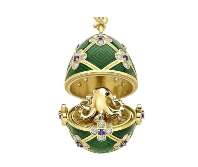 Το φερόμενο ως κλεμμένο αυγό Φαμπερζέ είναι διακοσμημένο με 60 λευκά διαμάντια και 15 μπλε ζαφείρια, σύμφωνα με την ιστοσελίδα του κοσμηματοπωλείου, και ανοίγει για να αποκαλύψει ένα  χταπόδι – μινιατούρα από χρυσό 18 καρατίων.