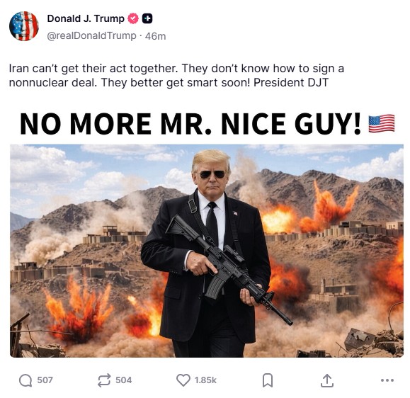 «Το Ιράν δεν μπορεί να βρει το δρόμο του. Δεν ξέρουν πώς να υπογράψουν μια μη πυρηνική συμφωνία. Καλύτερα να λογικευτούν σύντομα!», έγραψε ο Αμερικανός ηγέτης στην πλατφόρμα του Truth Social, μαζί με μια εικόνα του στην οποία παρουσιάζεται να κρατά ένα όπλο με φόντο ένα βουνό στο οποίο γίνονται εκρήξεις, με τη λεζάντα «ΤΕΡΜΑ ΤΟ ΚΑΛΟ ΠΑΙΔΙ!»