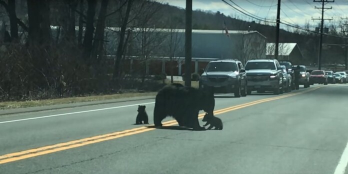 Το περιστατικό σημειώθηκε στο Γουίντσεστερ του Κονέκτικατ και οι οδηγοί κατάφεραν να το αποτυπώσουν σε βίντεο καθώς η αστυνομία σταμάτησε την κυκλοφορία και στις δύο κατευθύνσεις ώστε η μαμά αρκούδα να μεταφέρει με ασφάλεια τα αρκουδάκια της.