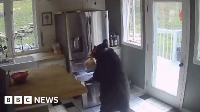 Surveillance footage shows the moment a bear entered a home in Connecticut looking for food and stole a frozen lasagne 🐻🍝 pic.twitter.com/I1c9OSbi41