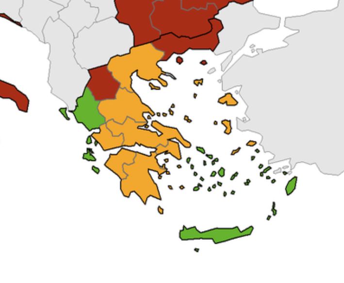 Με πράσινο έχουν χρωματιστεί η Ήπειρος, η Κρήτη και μεγάλο μέρος της νησιωτικής Ελλάδας στον αναθεωρημένο χάρτη που έδωσε χθες στη δημοσιότητα το Ευρωπαϊκό Κέντρο Πρόληψης και Ελέγχου Νοσημάτων (ECDC).