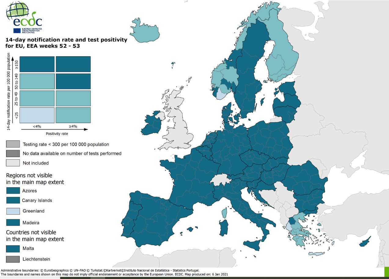 Συγκριτικά, μόνο μια μικρή επαρχία της νότιας Νορβηγίας βρίσκεται επίσης στο «πράσινο». Η υπόλοιπη Ελλάδα, πλην της Δυτικής Μακεδονίας που βρίσκεται στο «κόκκινο», είναι χρωματισμένη «πορτοκαλί», μαζί με τη Φινλανδία, μεγάλο μέρος της Νορβηγίας και την Κορσική. Όλη η υπόλοιπη Ευρώπη βρίσκεται στο «κόκκινο», δηλαδή καταγράφονται πάνω από 150 κρούσματα ανά 100.000 πληθυσμού. Να σημειωθεί ότι το ECDC δεν συλλέγει στοιχεία για τη Βρετανία, την Ελβετία, τις βαλκανικές χώρες (εκτός εκείνων που είναι μέλη της ΕΕ), την Ουκρανία, τη Λευκορωσία και τη Ρωσία.