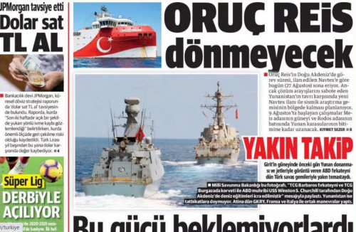 Συγκεκριμένα, σε δημοσίευμά της η Γενί Σαφάκ αναφέρει ότι το Oruc Reis δεν πρόκειται να επιστρέψει σήμερα στην Τουρκία, εξαιτίας της στάσης της Ελλάδας που «σαμποτάρει την αναζήτηση λύσης, και θα διευρύνει τις έρευνές του, φτάνοντας ίσως και κοντά στο Καστελόριζο και δυτικά της Ρόδου».