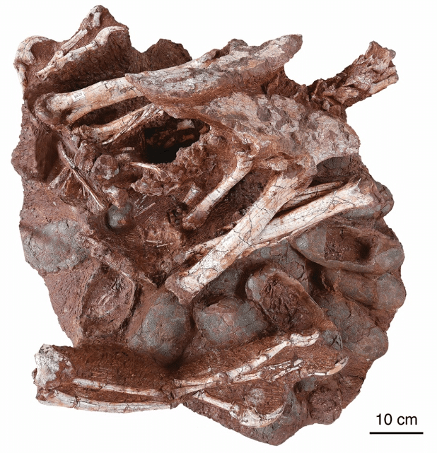 Οι επιστήμονες γιορτάζουν την πρώτη ανακάλυψη ενός δεινοσαύρου που εντοπίστηκε να κάθεται σε μια φωλιά αυγών με απολιθωμένα έμβρυα.