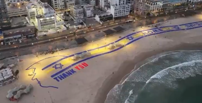 Ένα τεράστιο πανό που ευχαριστεί τον Πρόεδρο των Ηνωμένων Πολιτειών Ντόναλντ Τραμπ βρίσκεται στην παραλία του Τελ Αβίβ, σύμφωνα με πλάνα που προβλήθηκαν από το Channel 12.