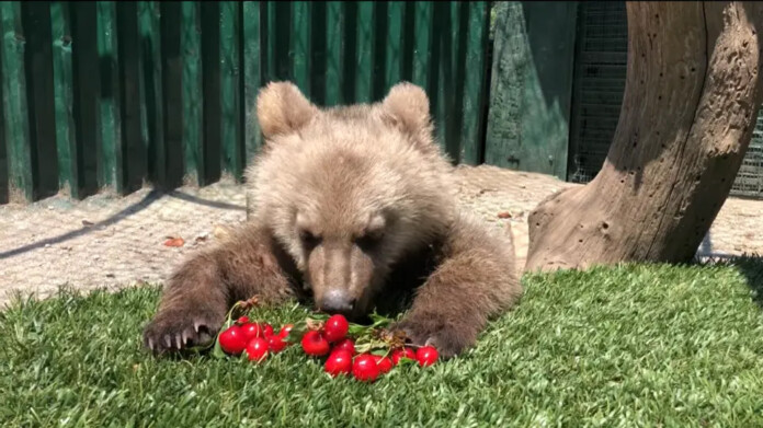 Το ορφανό αρκουδάκι που διεσώθη πριν μερικούς μήνες γίνεται viral με τα κεράσια του.