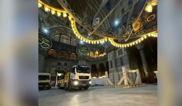 Αίσθηση και αντιδράσεις προκάλεσαν δημοσιεύματα και αναρτήσεις στα social media που έκαναν λόγο για «βαριά οχήματα» μέσα στην Αγία Σοφία, με αρκετούς να διαμαρτύρονται για πρόκληση φθορών στα ιστορικά δάπεδα.