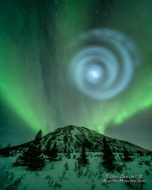 Το εξωπραγματικό βόρειο σέλας της Αλάσκα έγινε ακόμα πιο εξωπραγματικό το Σάββατο με την εμφάνιση μιας φωτεινής γαλάζιας σπείρας που απλώθηκε στον ουρανό σαν γαλαξίας.