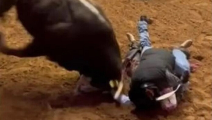 Στο βίντεο, ο 18χρονος αναβάτης εκσφενδονίζεται στον αέρα και καταλήγει στο έδαφος, με τον ταύρο να περνάει δίπλα από άλλους δύο ταυρομάχους και να επιστρέφει προς το μέρος του.