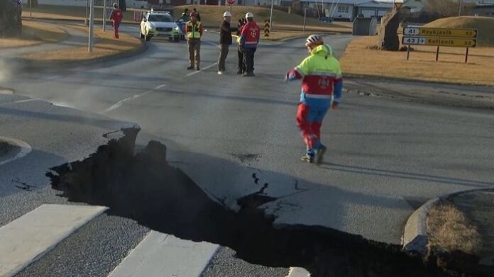 JUST IN – Video shows massive crack emanating steam in the center of Grindavik town of Iceland as the Island nation braces for a potential volcanic eruption pic.twitter.com/C6pK2NkGmW