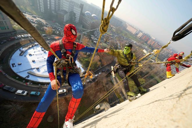 Στις φωτογραφίες που κυκλοφόρησαν οι ακροβάτες φαίνεται να φορούν στολές γνωστών ηρώων της Marvel και της DC, όπως του Spiderman, του Deadpool, του Hulk αλλά και του Batman.