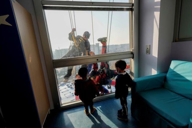 Ακροβάτες ντυμένοι σούπερ ήρωες εμφανίζονται στα παράθυρα του νοσοκομείου San Paolo στο Μιλάνο της Ιταλίας, για να χαιρετήσουν τα παιδιά της παιδιατρικής πτέρυγας και τους ασθενείς με Covid-19, την Τετάρτη 15 Δεκεμβρίου.