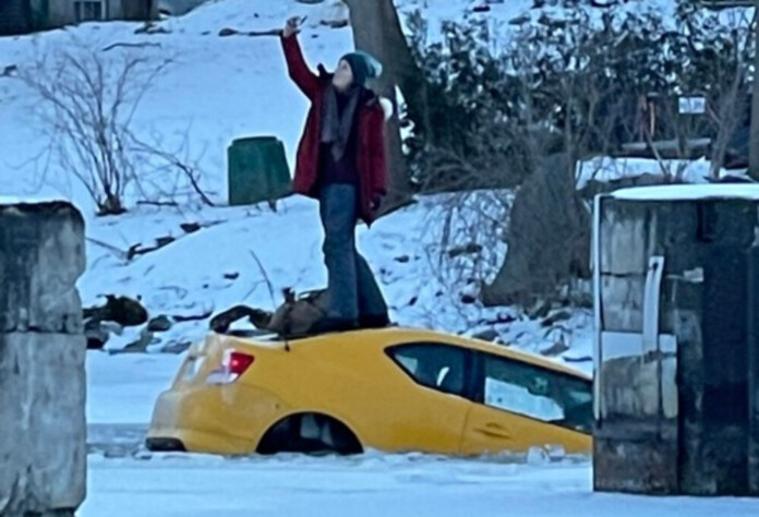 Φωτογραφίες και βίντεο που τραβήχτηκαν από τον ποταμό Ρίντο στην Οτάβα δείχνουν μια γυναίκα με κόκκινο παλτό να τραβά selfie, ενώ στέκεται στο πίσω μέρος μισοβυθισμένου αυτοκινήτου της.