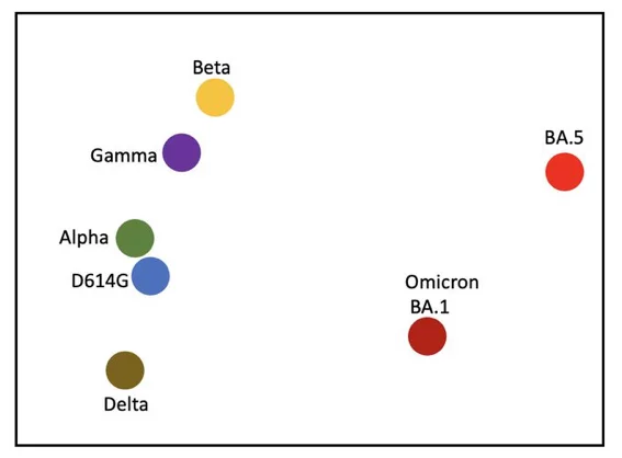 Οποιαδήποτε κι αν είναι η έκβαση όμως, αυτό που είναι σημαντικό είναι να τονίσουμε είναι ότι ο ιός έχει ένα μεγάλο εξελικτικό πεδίο να εξερευνήσει ακόμα. Το παρακάτω γράφημα οπτικοποιεί αυτό που θέλω να πω και προέρχεται από την προδημοσίευση της μελέτης για τα ενισχυτικά εμβόλια που στοχεύουν στις μεταλλαγμένες μορφές του ιού. Αυτό που βλέπουμε είναι πόσο διαφορετική είναι η αντιγονική ταυτότητα του Ο και του στελέχους Ο5 (ΒΑ.5) από τις μέχρι τότε μορφές του, αλλά επίσης διαπιστώνουμε πόσο ελεύθερο πεδίο υπάρχει για να αλλάξει ο ιός ακόμα. Όσο πιο πολύ εξελικτικός χώρος δίνεται στον ιό με την έλλειψη λήψης μη-φαρμακευτικών μέτρων και την ανεξέλεγκτη έκθεση του πληθυσμού, τόσο ο χώρος του γραφήματος θα γεμίζει με παραλλαγές που θα δίνουν καινούργια στελέχη με την χειρότερη εκδοχή του ιού: πιο μεταδοτικός και πιο ικανός να αποφεύγει το ανοσοποιητικό. Παρόλα αυτά τα mRNA εμβόλια κατά του ΒΑ.1 είναι αποτελεσματικά για αυτό το στέλεχος του Ο αλλά κάπως λιγότερο για το ΒΑ.5 (Πηγή: Branche et al, 2022 MedRxiv: https://www.medrxiv.org/content/10.1101/2022.07.12.22277336v1).