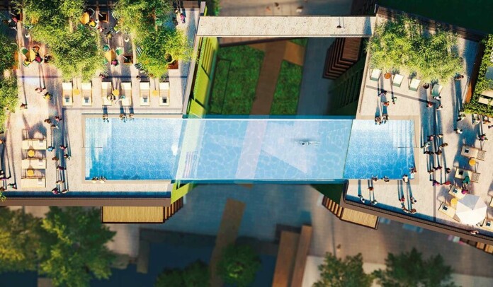 Ονομάζεται Sky Pool και πρόκειται για μία διάφανη πισίνα που συνδέει δύο ουρανοξύστες στο Λονδίνο, στο ύψος του δέκατου ορόφου. Η πισίνα θα είναι διαθέσιμη μόνο για τους τυχερούς κατοίκους των κτιρίων αυτών. Σύμφωνα με όσα μεταδίδει το CNN πρόκειται για τη μεγαλύτερη ακρυλική κατασκευή αυτού του τύπου στον κόσμο και μία από τις πλέον αναγνωρίσιμα έργα της κοινοπραξίας των εταιρειών EcoWorld και Ballymore που συνεργάστηκαν για τη δημιουργία του συγκροτήματος Embassy Gardens όπου επίσης υπάρχουν μπαρ, εστιατόρια και καταστήματα.