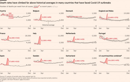 Σε όλες τις χώρες, πλην της Δανίας, οι υπερβάλλοντες συνολικοί θάνατοι υπερβαίνουν τα επίσημα στατιστικά θανάτων από κορωνοϊό. Σύμφωνα με τη βρετανική εφημερίδα, στη διάρκεια της πανδημίας οι θάνατοι από οποιαδήποτε αιτία αυξήθηκαν κατά 60% στο Βέλγιο, κατά 51% στην Ισπανία, κατά 42% στην Ολλανδία και κατά 34% στη Γαλλία.