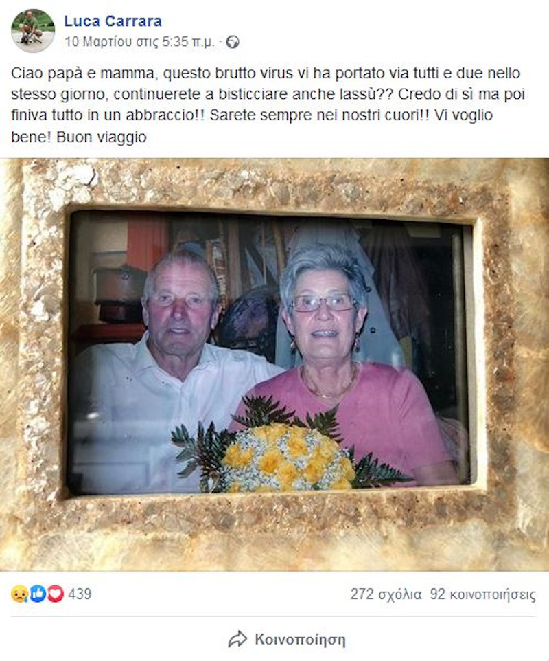 «Τα αγαπημένα σου πρόσωπα μένουν μόνα τους και δεν μπορείς ούτε αντίο να τους πεις, να τους αγκαλιάσεις, να προσπαθήσεις κάπως να απαλύνεις τον πόνο τους», είπε. Σε ένα συγκινητικό αποχαιρετιστήριο μήνυμα προς τους γονείς του, που ανήρτησε στο Facebook ο Λούκα Καράρα αναφέρει: «Γεια σας, μαμά και μπαμπά. Φύγατε μαζί την ίδια μέρα λόγω αυτού του κακού ιού. Θα συνεχίσετε να τσακώνεστε κι εκεί πάνω άραγε; Μάλλον, αλλά όπως πάντα, όλα θα τελειώνουν με μια αγκαλιά…»